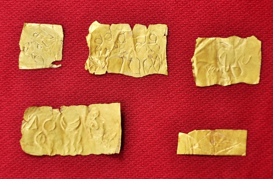 The engravings on the gold leaves depict people, animals, mythical creatures, plants, objects, and written characters.