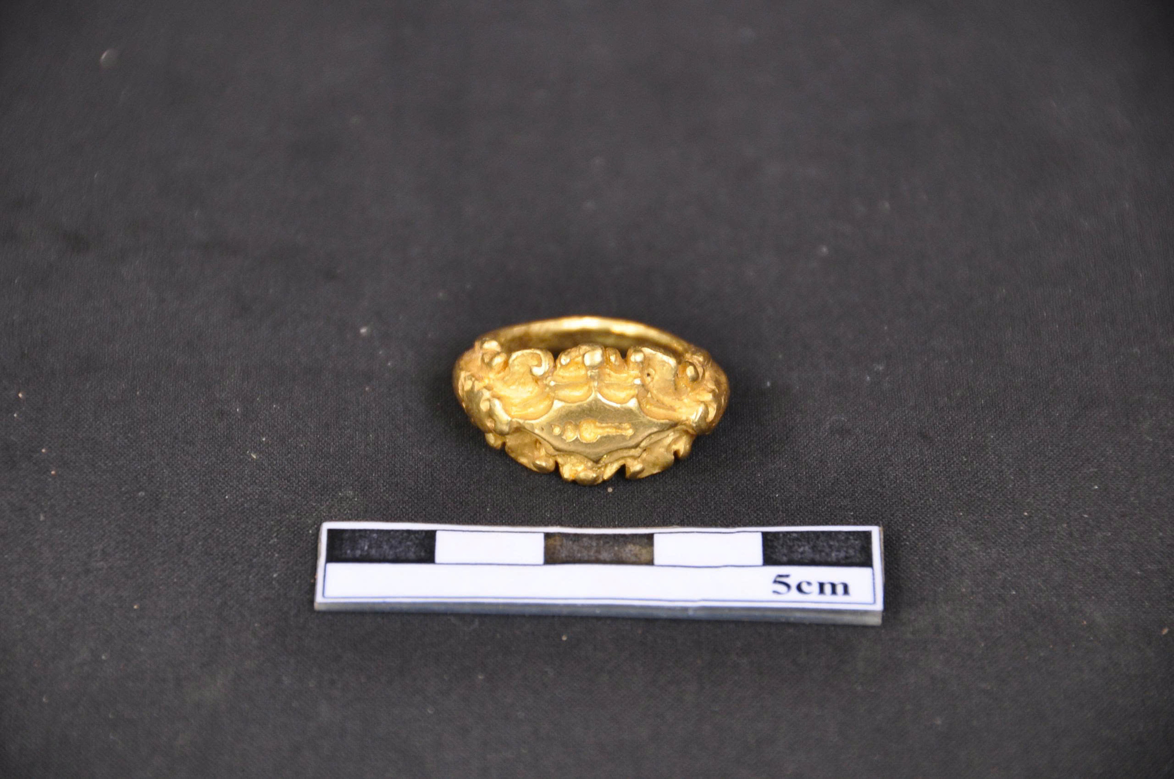 The heaviest ring in the collection, at 5.8 chi, is a solid round ring. The center of the ring is engraved with an image of the Sankha conch, a symbol held by the god Vishnu (Hinduism).