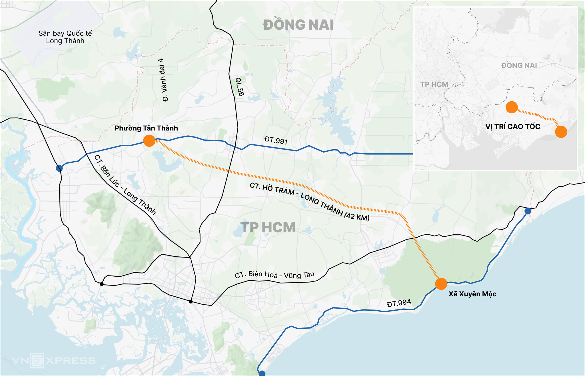 The expressway stretches over 42 km, starting with a connection to Ho Chi Minh City's Ring Road 4 and provincial road DT.991 (in Tan Thanh ward). Its endpoint links to provincial road DT.994, part of the Vung Tau - Binh Chau coastal axis (in Xuyen Moc commune). The project features an 8-lane design with a speed limit of 100 km/h, includes parallel roads, and will utilize nearly 400 hectares of land.
