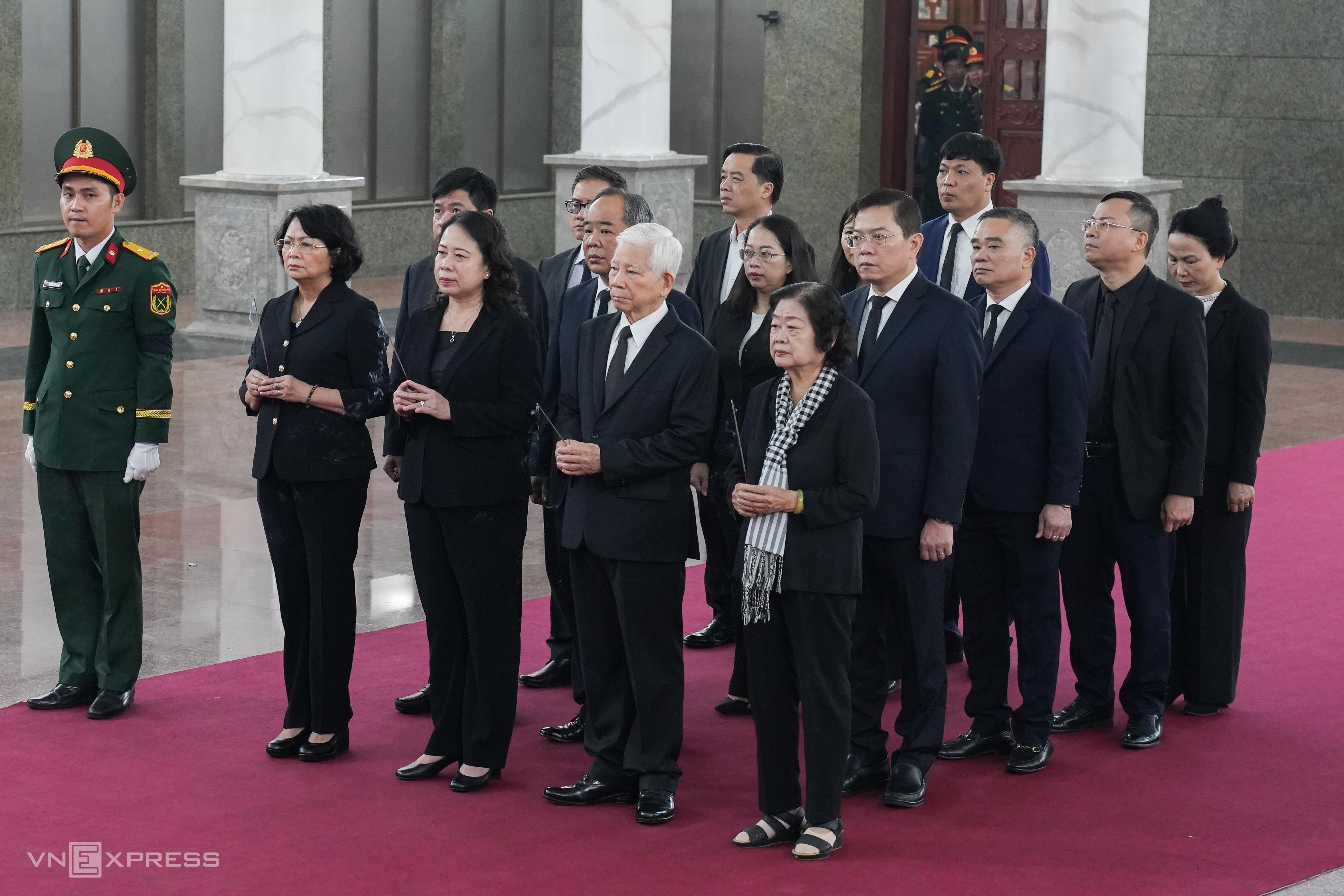 A presidential delegation, led by Vice President Vo Thi Anh Xuan (third from right), paid their respects. The delegation also included former President Nguyen Minh Triet (second from right), former Vice President Truong My Hoa (first on right), and former Vice President Dang Thi Ngoc Thinh (second from left).