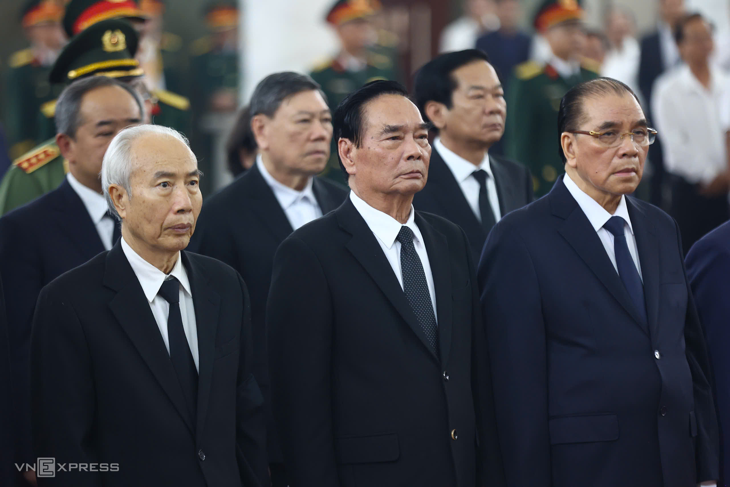 Among those attending the funeral were former General Secretary Nong Duc Manh (first from right), former Standing Member of the Secretariat Le Hong Anh (center), and former President of the Vietnam Fatherland Front Huynh Dam (first from left).