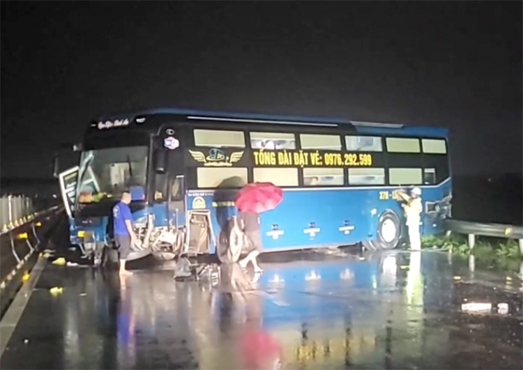 The strong impact caused the bus to spin sideways, blocking the entire right lane in the North - South direction. The 5-seater car was pushed a few meters, hitting the steel guardrail on the roadside. Occupants of both vehicles were stunned but not injured.