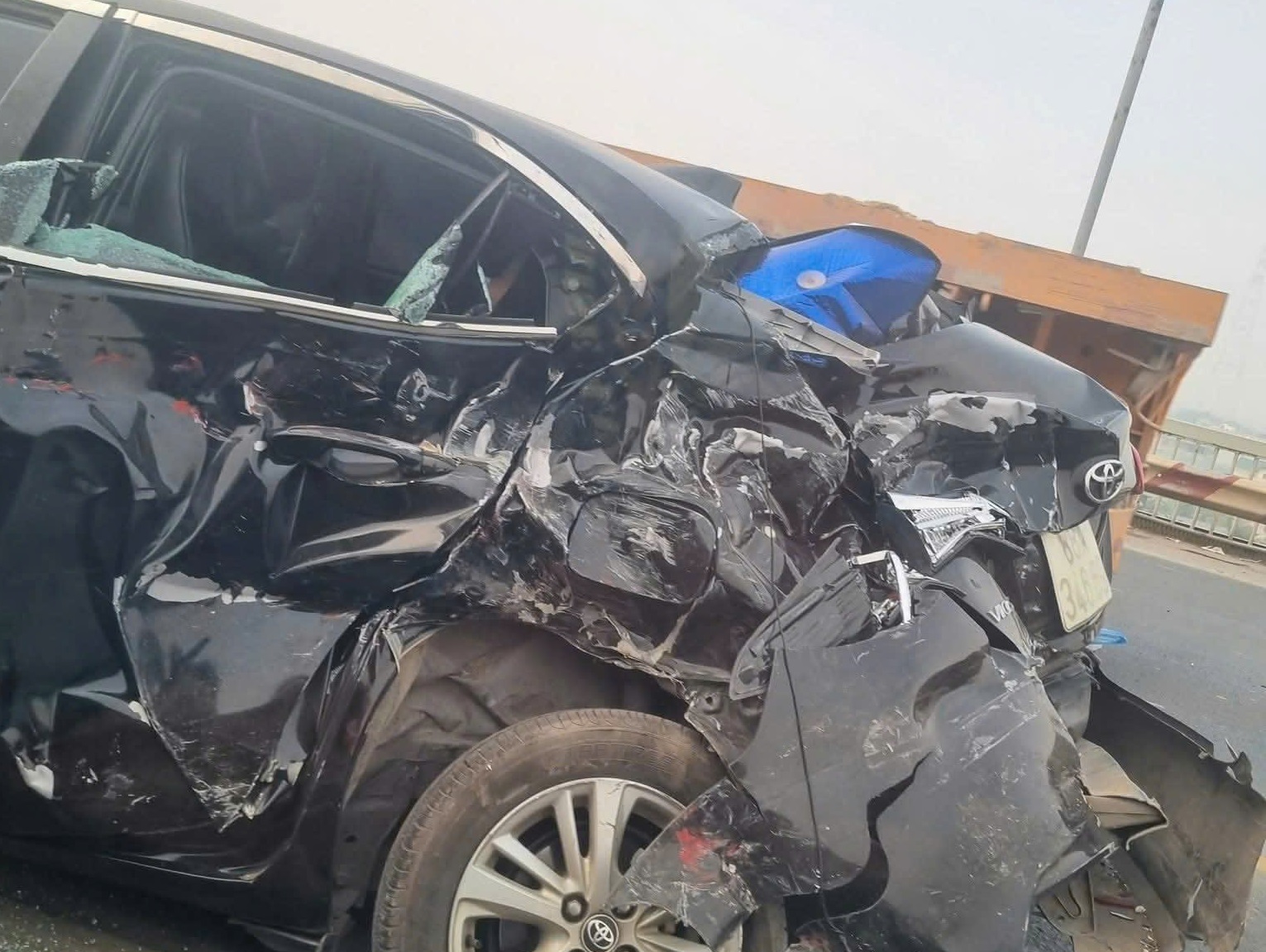 Around 9:30 AM on 2/12, a passenger bus with a Hoa Binh license plate, traveling towards Dong Anh, collided with the rear of a 4-seater car registered in Vinh Phuc. The incident occurred near the middle of Thang Long bridge.