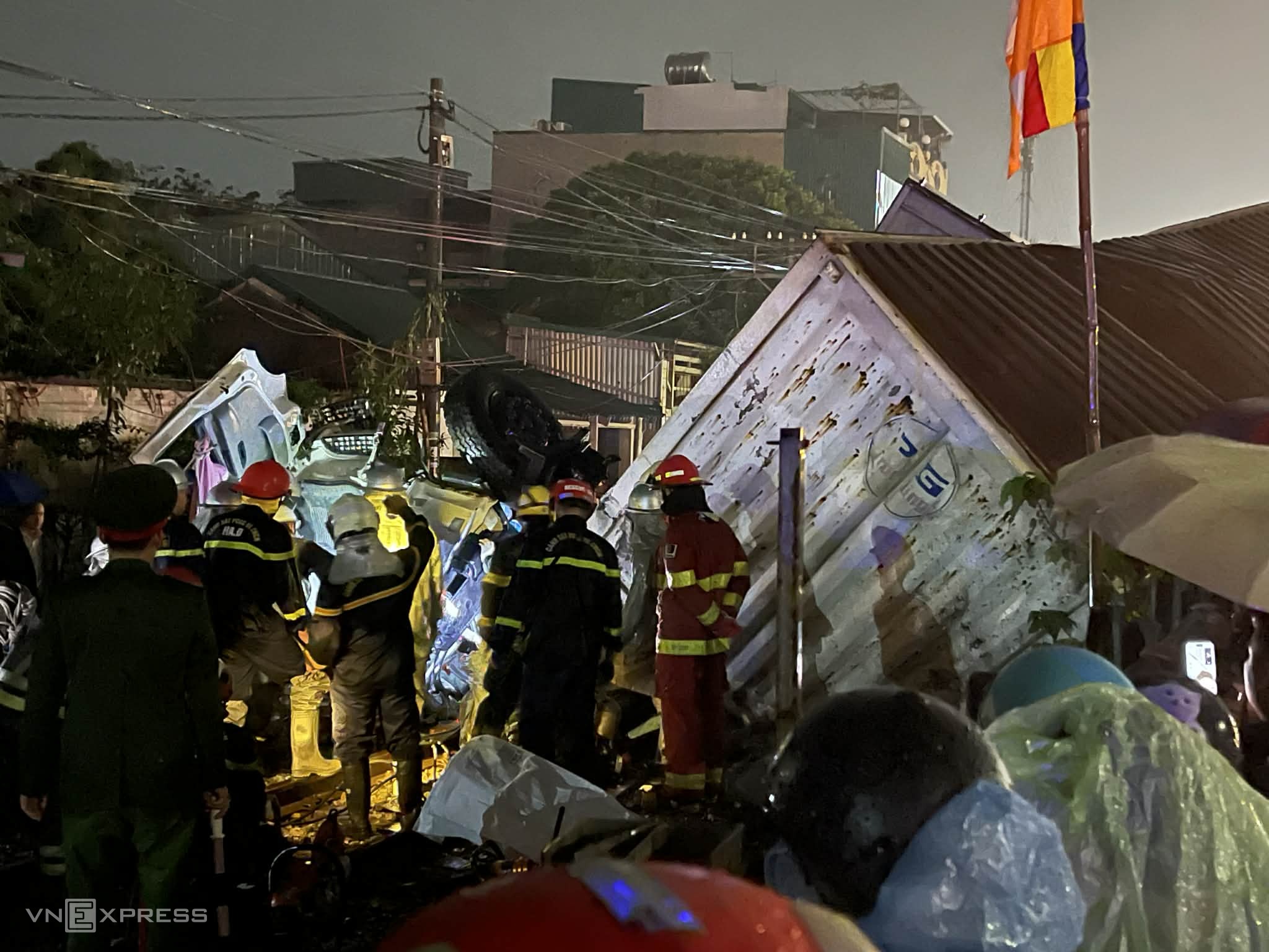 Around 20:00 on 25/2, a passenger train traveling on the north-south line collided with a container truck while passing through Ngoc Hoi street. The powerful impact caused the container to overturn, and both the front of the truck and the train's locomotive were severely dented and deformed.