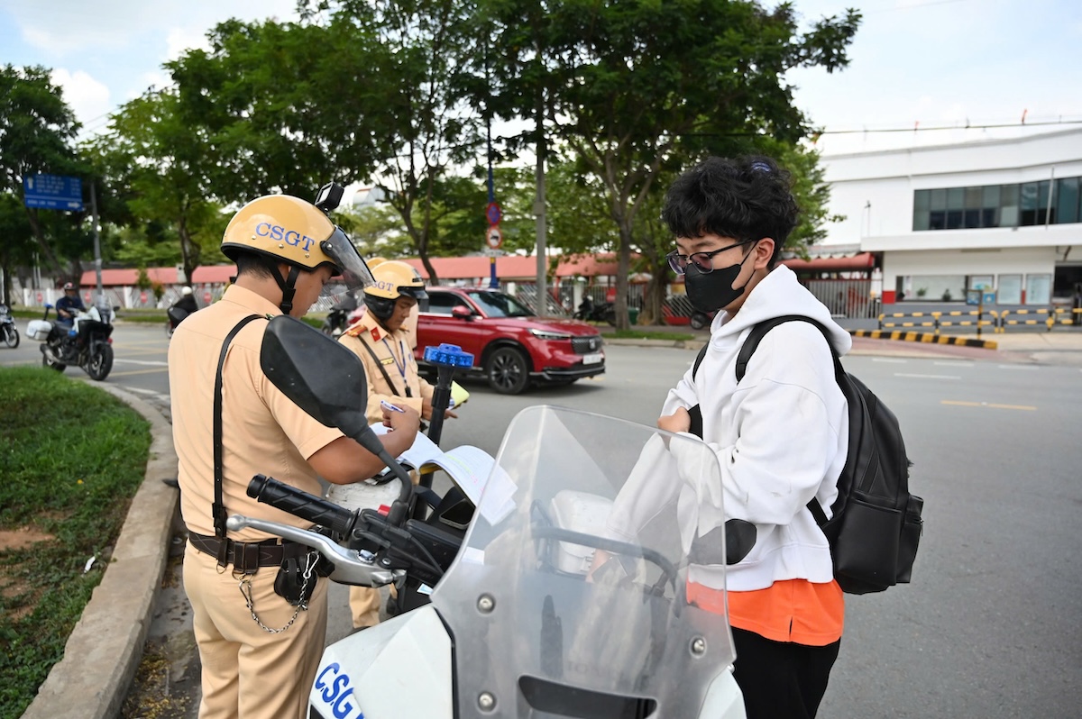 A student receives a fine for jaywalking. Photo: Ho Dinh