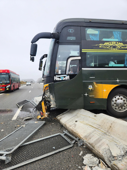 A sleeper bus collided with the median barrier on the Cam Lam - Vinh Hao expressway. Photo: Thai Ha