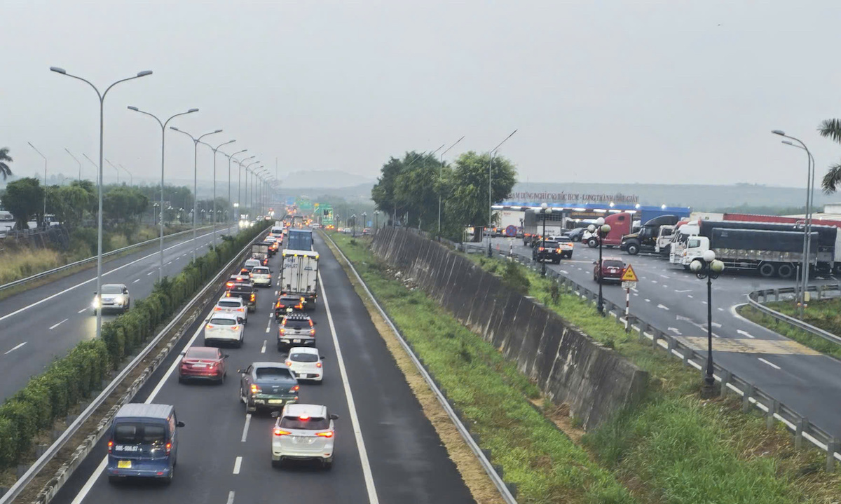 From early morning, the Ho Chi Minh City – Long Thanh – Dau Giay expressway experienced localized traffic jams from the An Phu interchange to Long Thanh. As vehicles approached the interchange with the Phan Thiet – Dau Giay expressway, the volume intensified, leading to nearly 10 km of congestion and slow-moving traffic.
