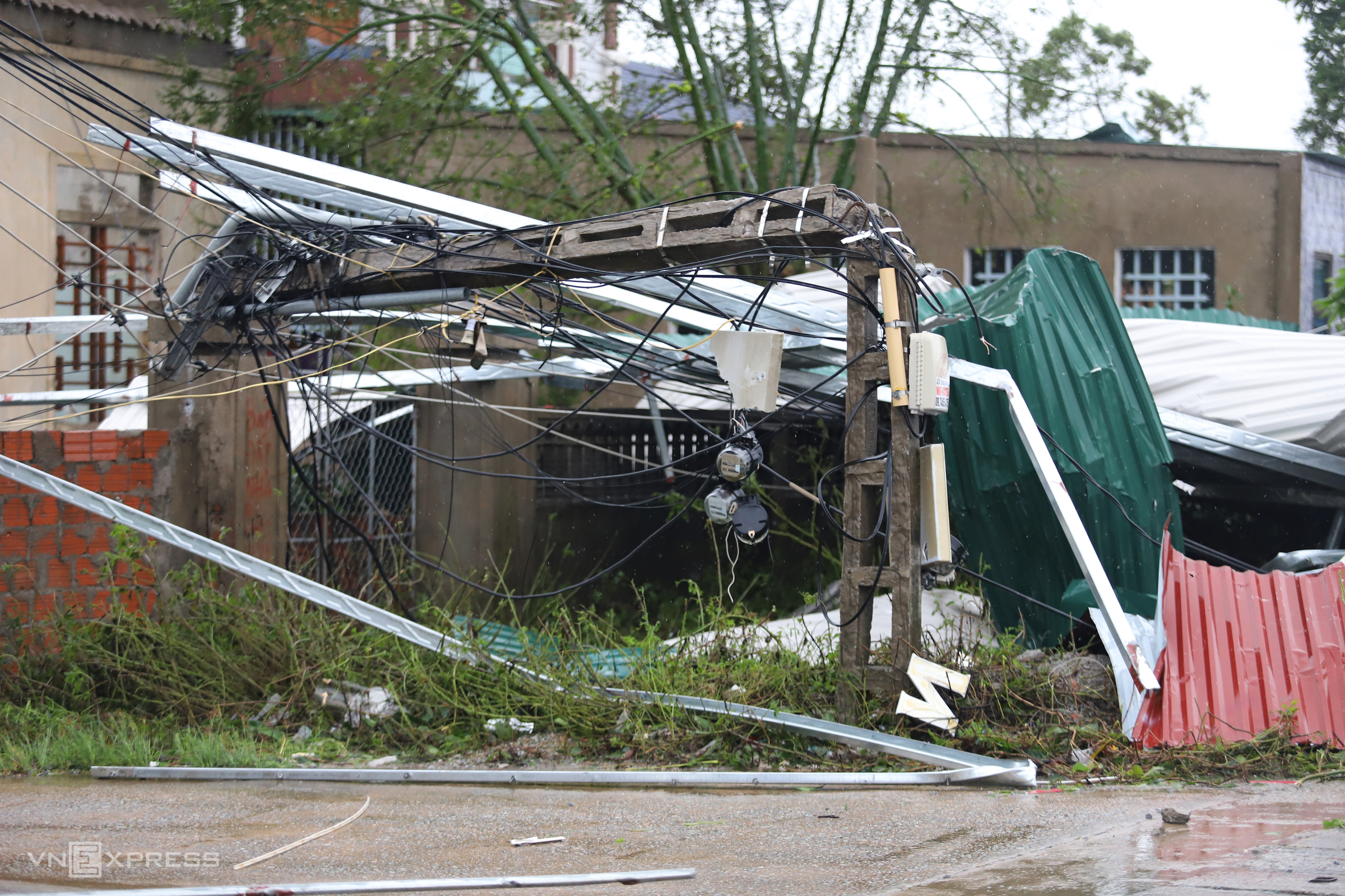 In the coastal communes of Nghi Xuan district, numerous low-voltage power poles were also downed, bringing down power and telecommunication lines. The poles were covered with corrugated iron sheets blown off houses by the wind. Photo: Duc Hung