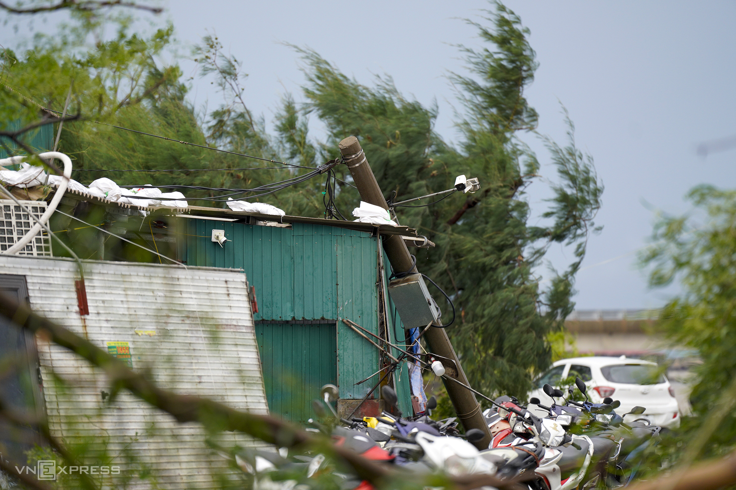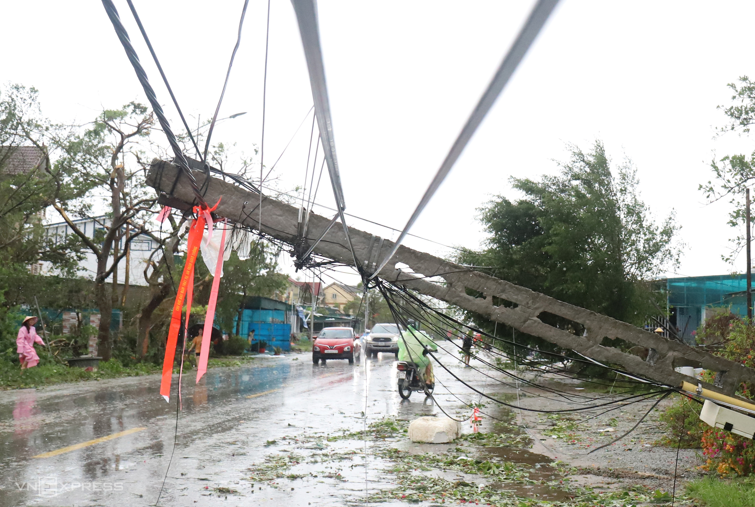 Along the coastal road through Co Dam commune, fallen power poles blocked more than half of the 8-meter-wide road, with wires dangling at a height of about 2 meters, creating a traffic hazard. Cars and motorbikes had to slow down and swerve to avoid them. Photo: Duc Hung