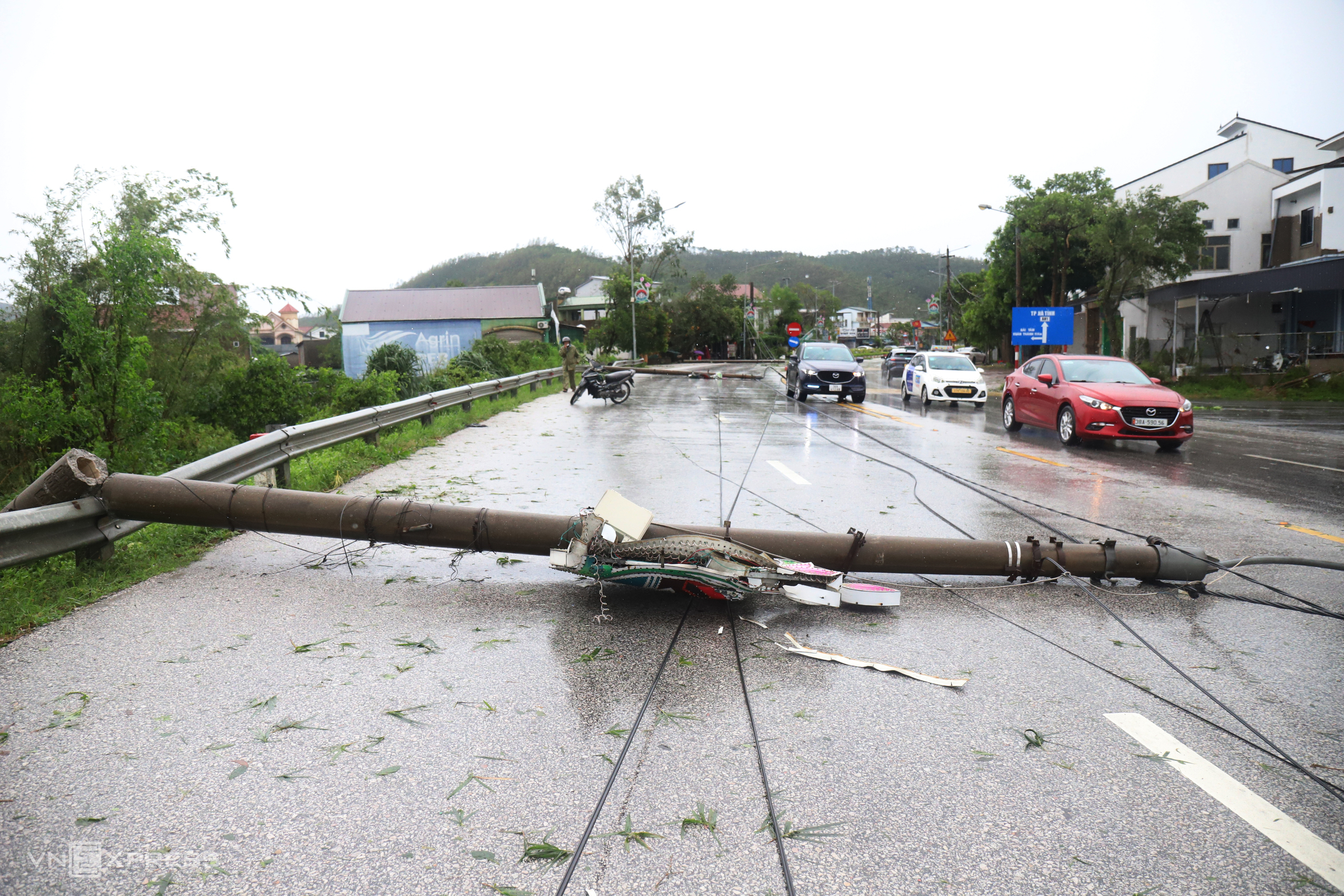 On Highway 1 through Nghi Xuan commune, four fallen power poles blocked half of the 12-meter-wide road, causing traffic jams. Photo: Duc Hung
