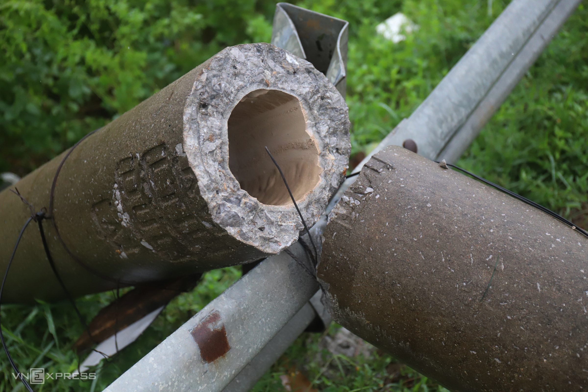 A medium-voltage power pole snapped in half. According to reports, Typhoon Kajiki downed 761 power poles in Ha Tinh, leaving nearly 350,000 customers without power. Photo: Duc Hung |