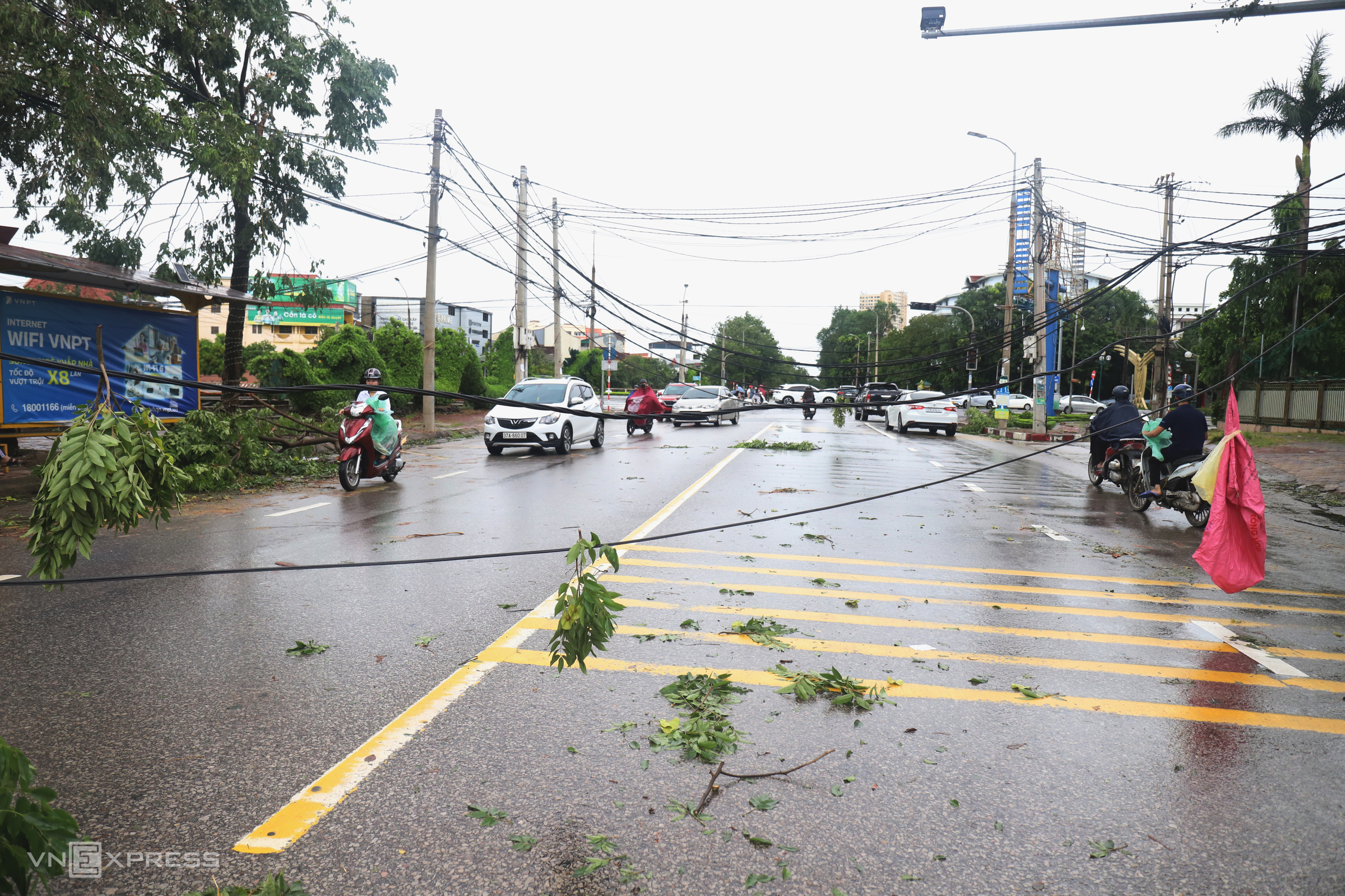 This morning, power lines sagged dangerously low across many streets of Vinh City, posing a traffic hazard. Photo: Duc Hung