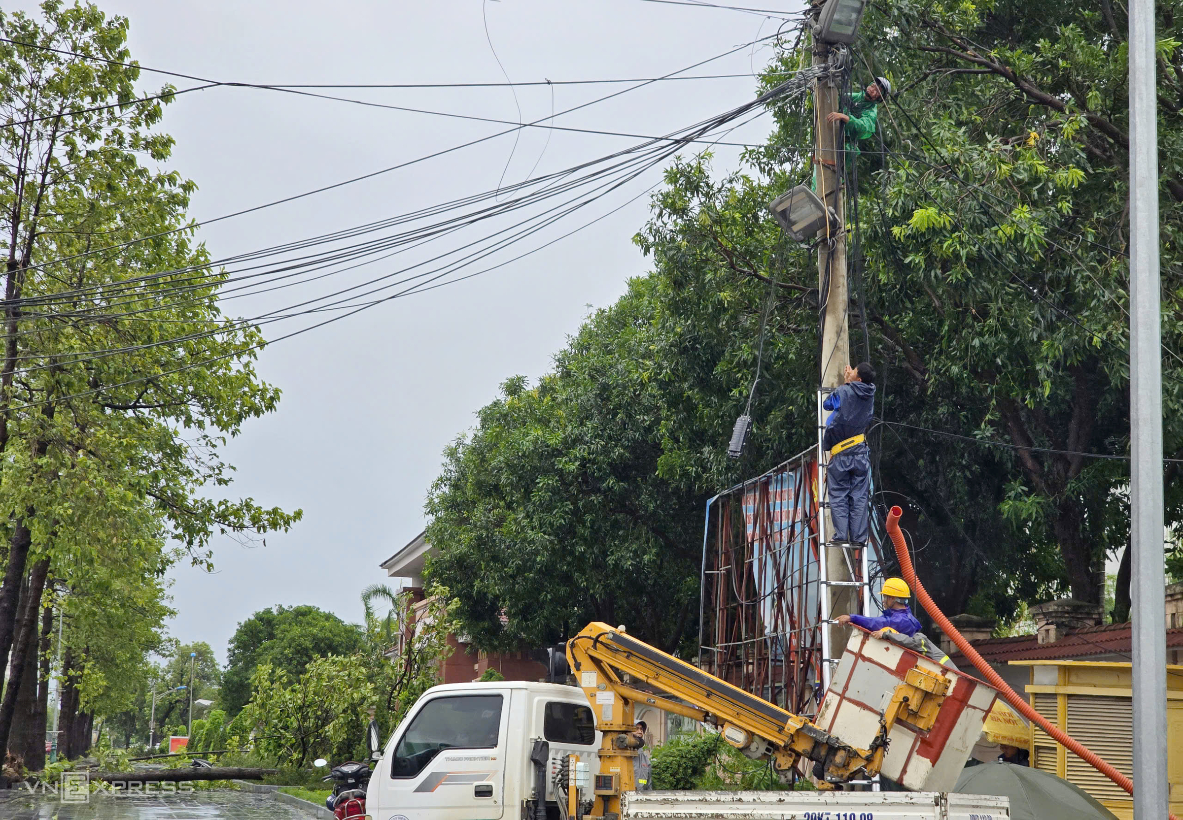 Power crews are working to restore service in Vinh City. By 3 p.m., power had been restored to some areas. Photo: Duc Hung