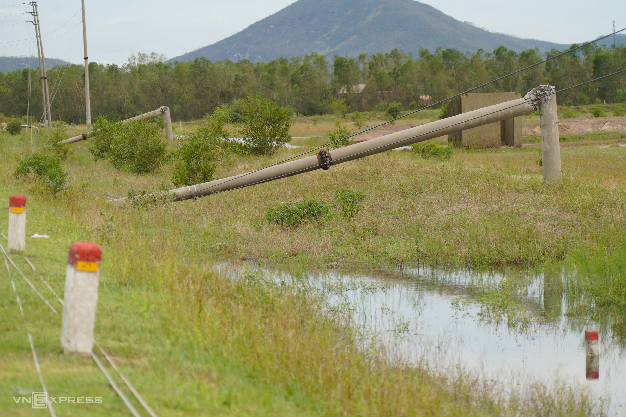 Many power poles in the coastal area of Thien Cam were downed, causing widespread power outages from noon on 25/8 to the afternoon of 26/8. Power has not yet been restored. Photo: Nguyen Dong