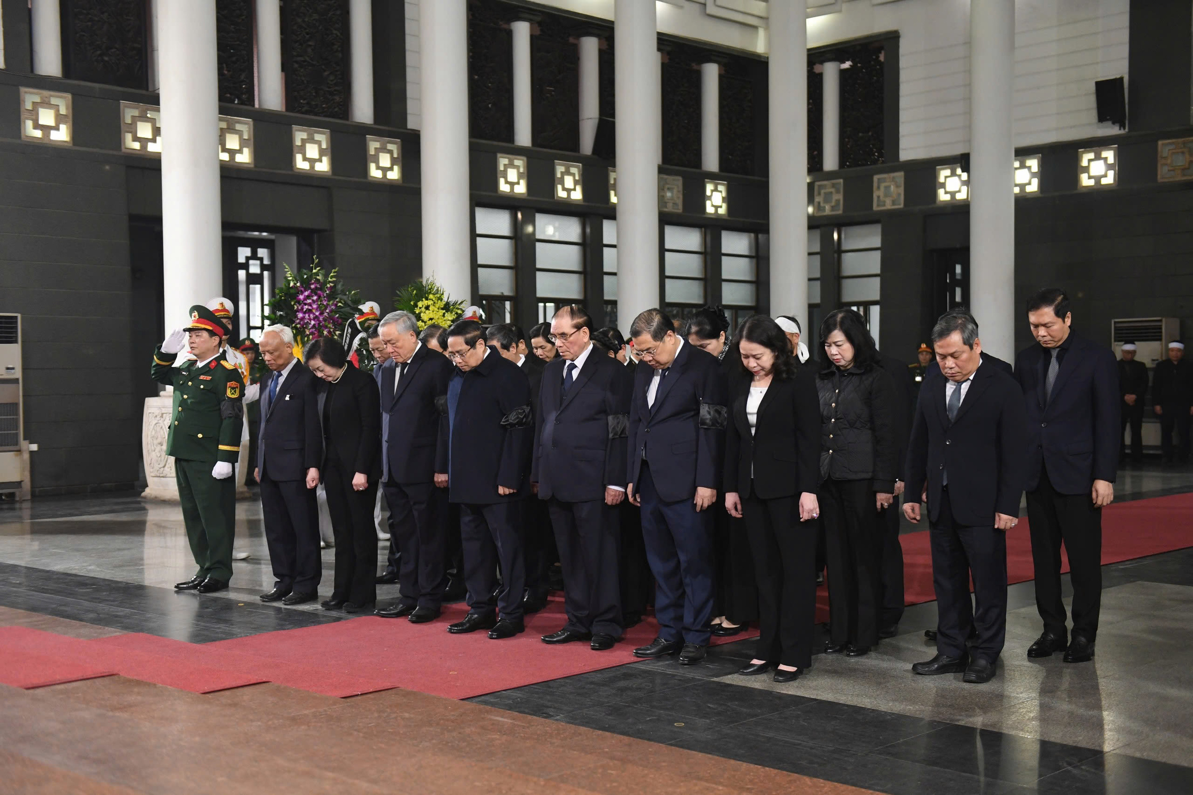 Prime Minister Pham Minh Chinh led a delegation from the Party Central Committee to pay respects and offer condolences to the family. General Secretary To Lam, National Assembly Chairman Tran Thanh Man, and Permanent Member of the Secretariat Tran Cam Tu sent wreaths.
