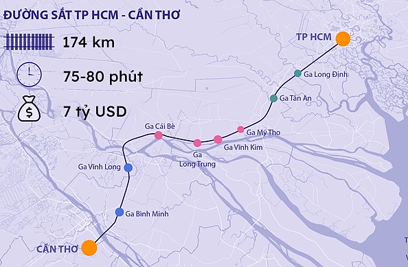 The project's starting point is planned at Thu Thiem station in Ho Chi Minh City, connecting to the existing North-South railway. The line would terminate at Dat Mui station in Ca Mau, passing through six provinces and cities: Ho Chi Minh City, Dong Thap, Vinh Long, Can Tho, An Giang, and Ca Mau.