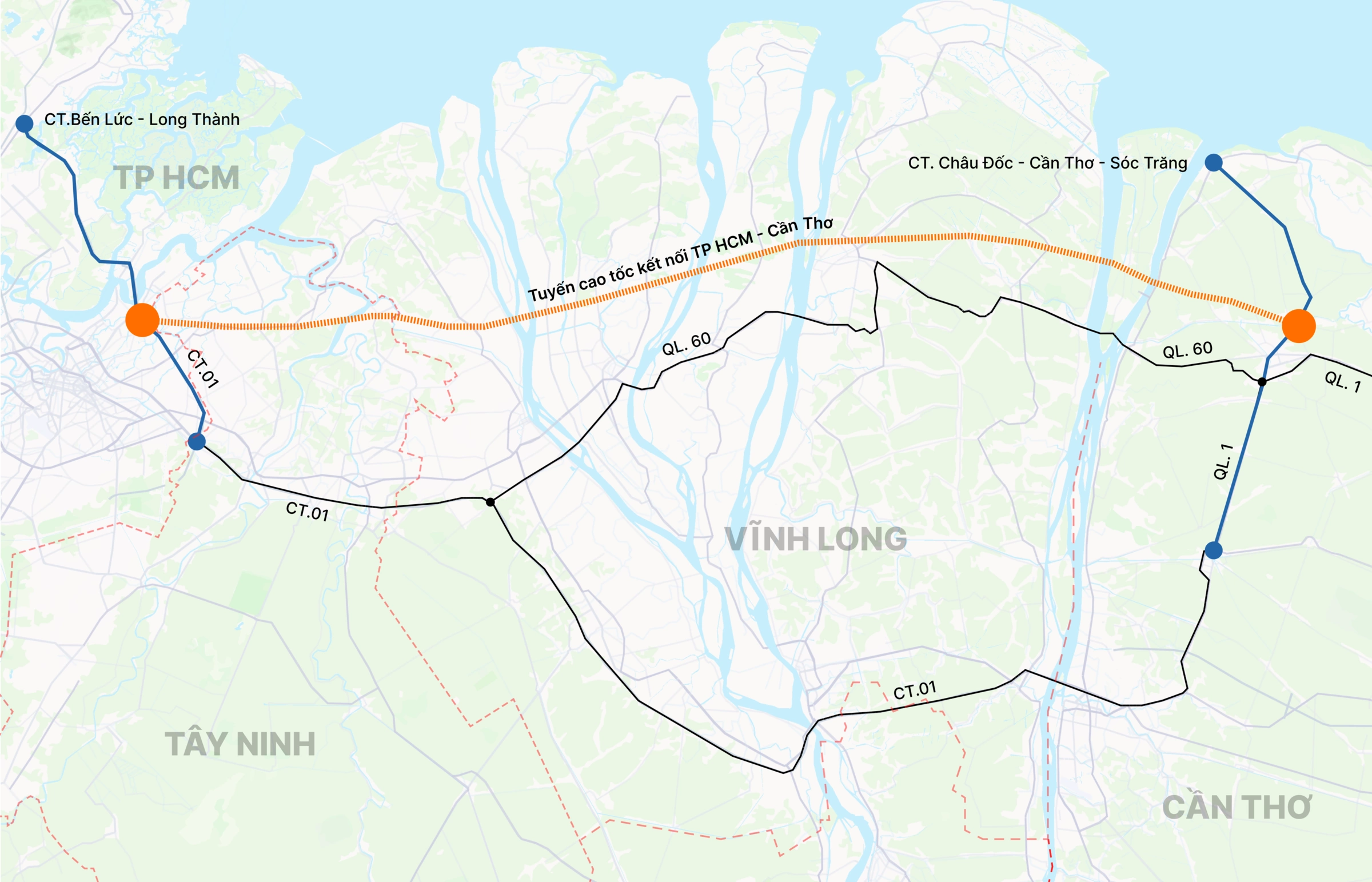 The expressway will begin at its connection point with the Ben Luc – Long Thanh expressway in Ho Chi Minh City, extend through the Mekong Delta provinces, and conclude at the Chau Doc – Can Tho – Soc Trang expressway. The total investment is estimated at over 68,000 billion VND, structured as a public-private partnership (PPP).