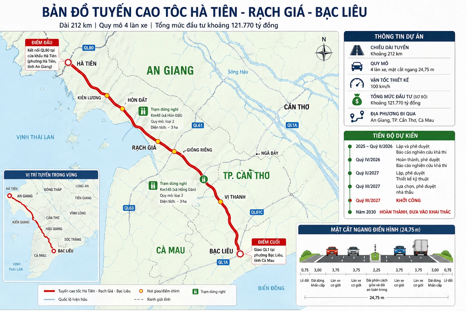 The expressway will traverse An Giang, Can Tho, and Ca Mau provinces and cities. Its starting point connects national highway 80 at the Ha Tien border gate in Ha Tien ward, An Giang province, while the ending point intersects national highway 1 in Bac Lieu ward, Ca Mau province. Technical design is scheduled for 2027, with construction expected to commence in Q3/2027 and completion by 2030.
