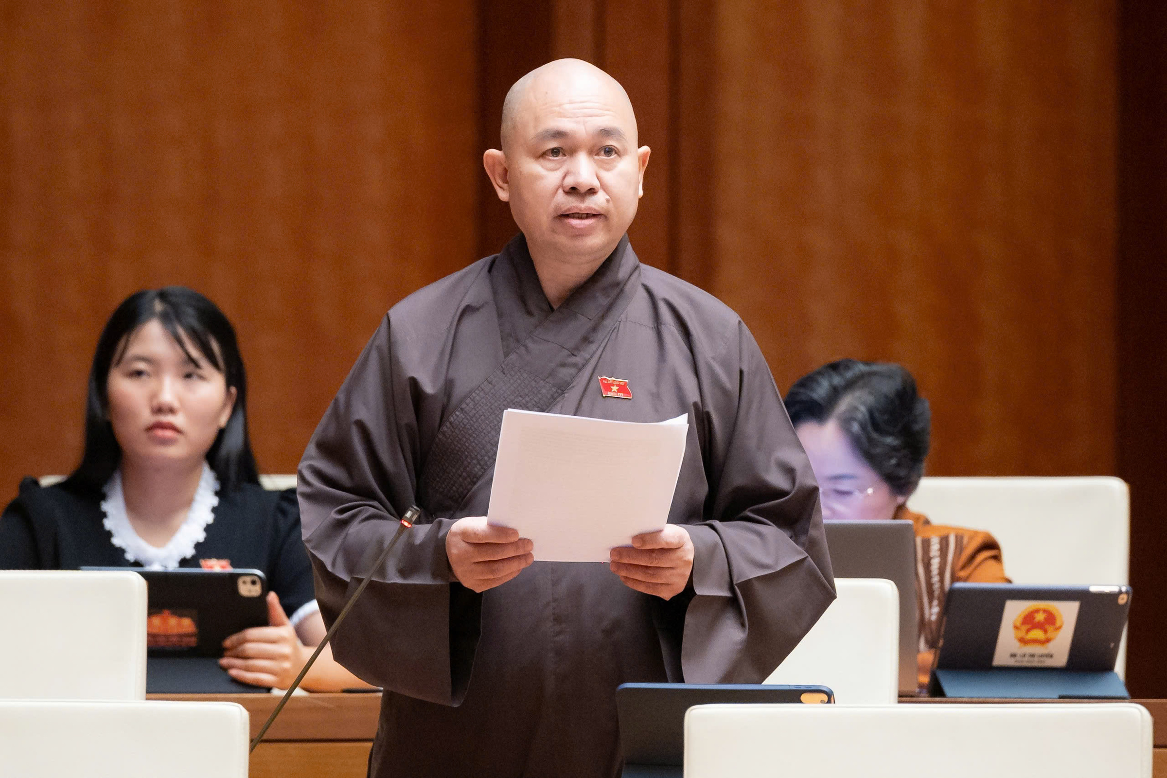 Most Venerable Thich Duc Thien, Deputy Chairman and Secretary General of the Executive Council of the Vietnam Buddhist Sangha, speaking at the National Assembly on the morning of 22/4. *Photo: National Assembly Media* |