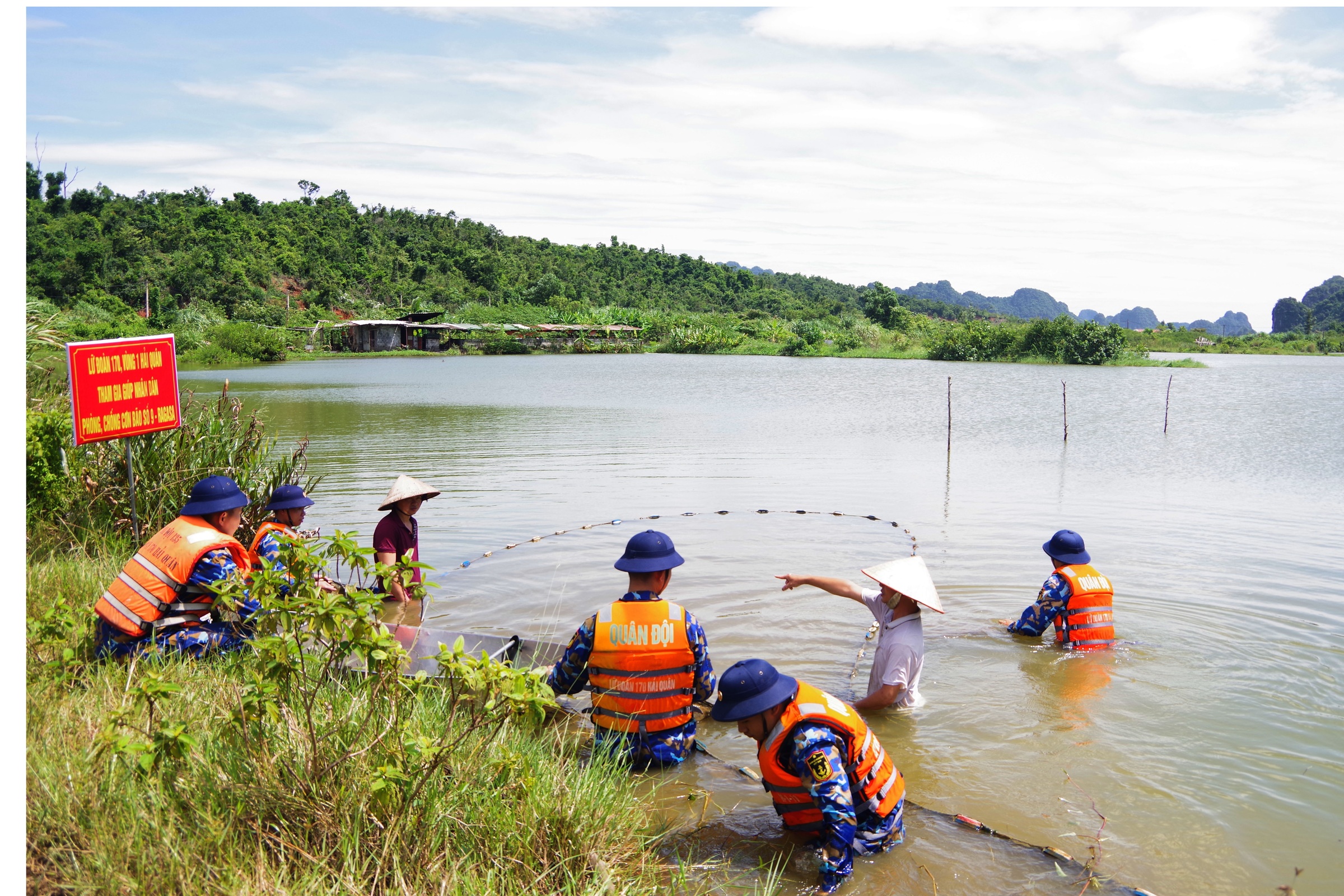 Officers and soldiers of Brigade 170 help Quang Ninh residents harvest fish before the storm. Photo: Doan Hiep