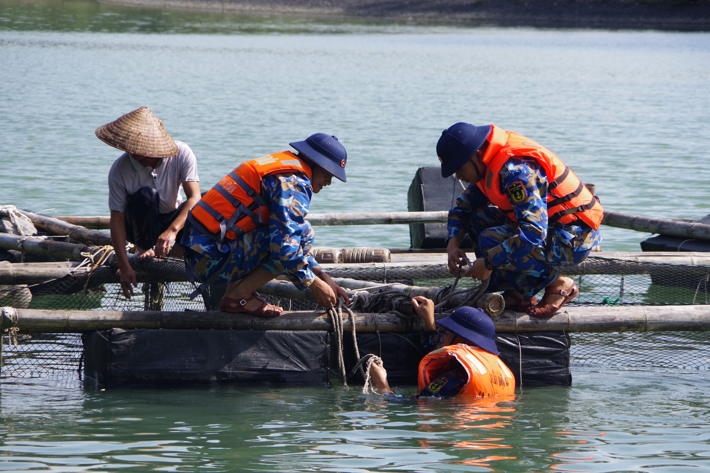 Navy soldiers help fishermen reinforce their seafood rafts. Photo: Doan Hiep