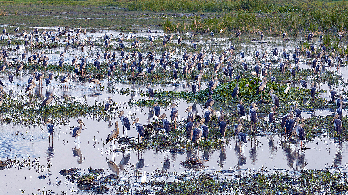 The asian openbill stork (*Anastomus oscitans*) typically has a wingspan of 0,6-1 m and weighs 1-1,5 kg. This species thrives in wetlands, riverine tidal flats, and coastal areas, primarily feeding on snails, crabs, frogs, and insects. In Vietnam, they are widely distributed across the Mekong Delta, appearing in other suitable habitats as well.