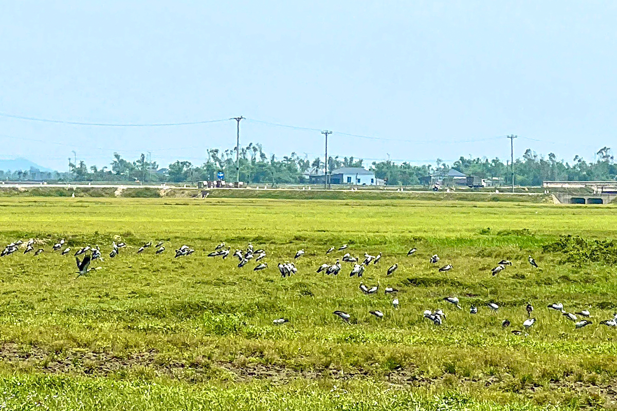 Asian openbill stork flock in Khu Bap fields, Song Tri ward, 22/4. *Trang Tuan*. |