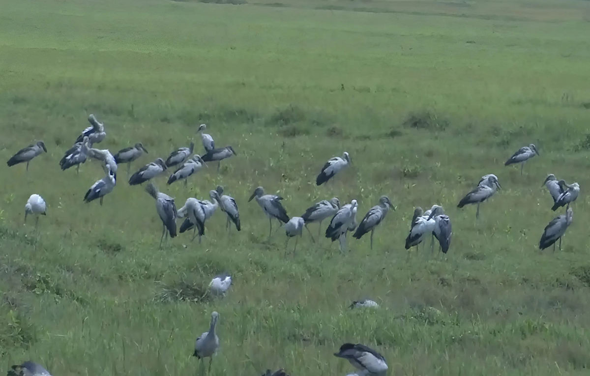 Known locally as snail storks, these tall, long-legged birds have white and black plumage with a greenish sheen. They typically visit the Khu Bap fields during early mornings and late afternoons to forage in groups, hunting golden apple snails and insects, before departing after a few hours. Many residents have visited the fields, observing the flock from several hundred meters away and sharing photos on social media.