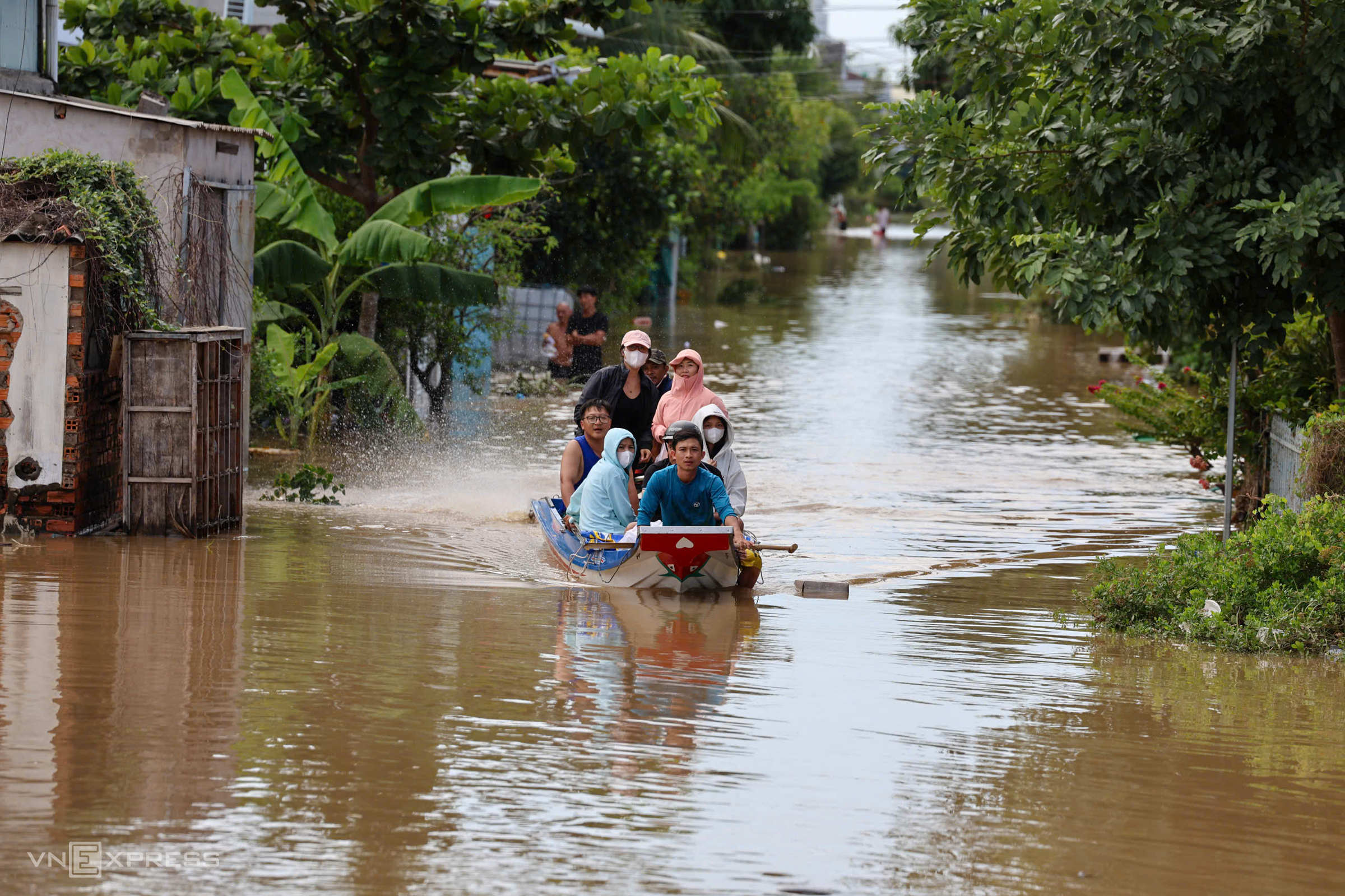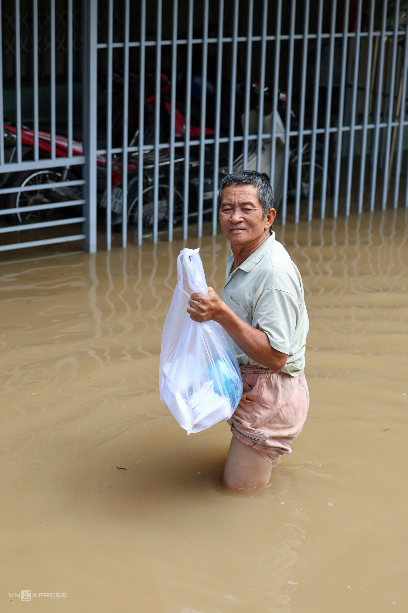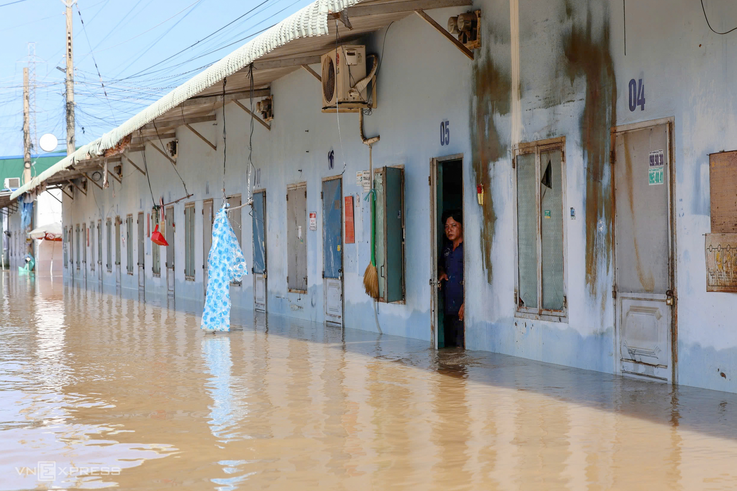 Water covered the area in front of a rental complex in Ham Thang ward. Some residents remained to protect their property.