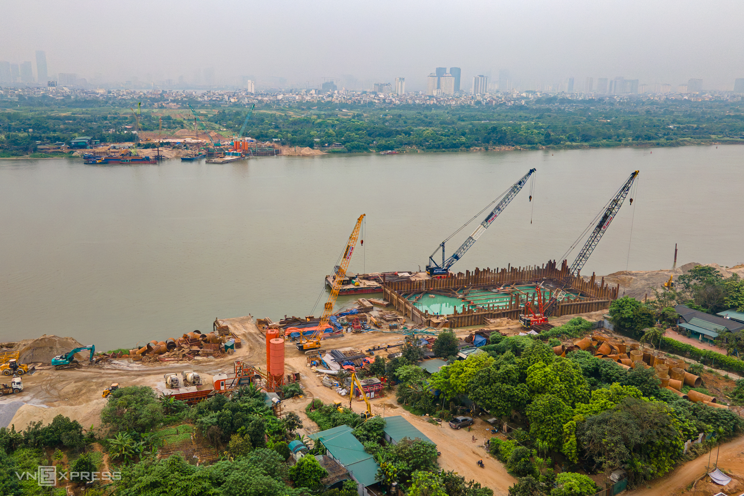 Many machines and workers have been mobilized for construction; several important items, such as main pier bored piles, underpasses, and the Nghi Tam interchange, are being implemented simultaneously.