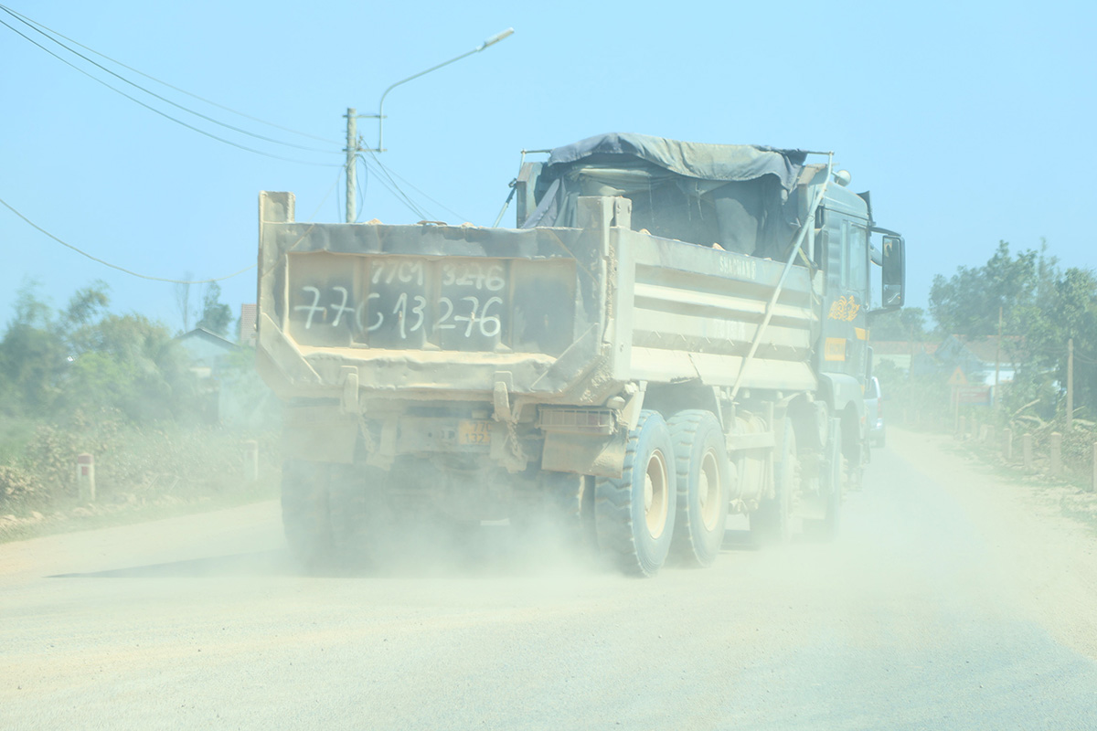 On the morning of 2/4, as a continuous line of trucks passed along National Highway 19B (An Nhon ward) and Provincial Road 638 (Hoi Son, Hoa Hoi, Binh Hiep, Binh An communes), thick layers of dust covered the roads, blowing directly into homes along both sides. By noon, intense heat caused dense dust to rise, creating "dust storms" that reduced visibility and made the air oppressive.