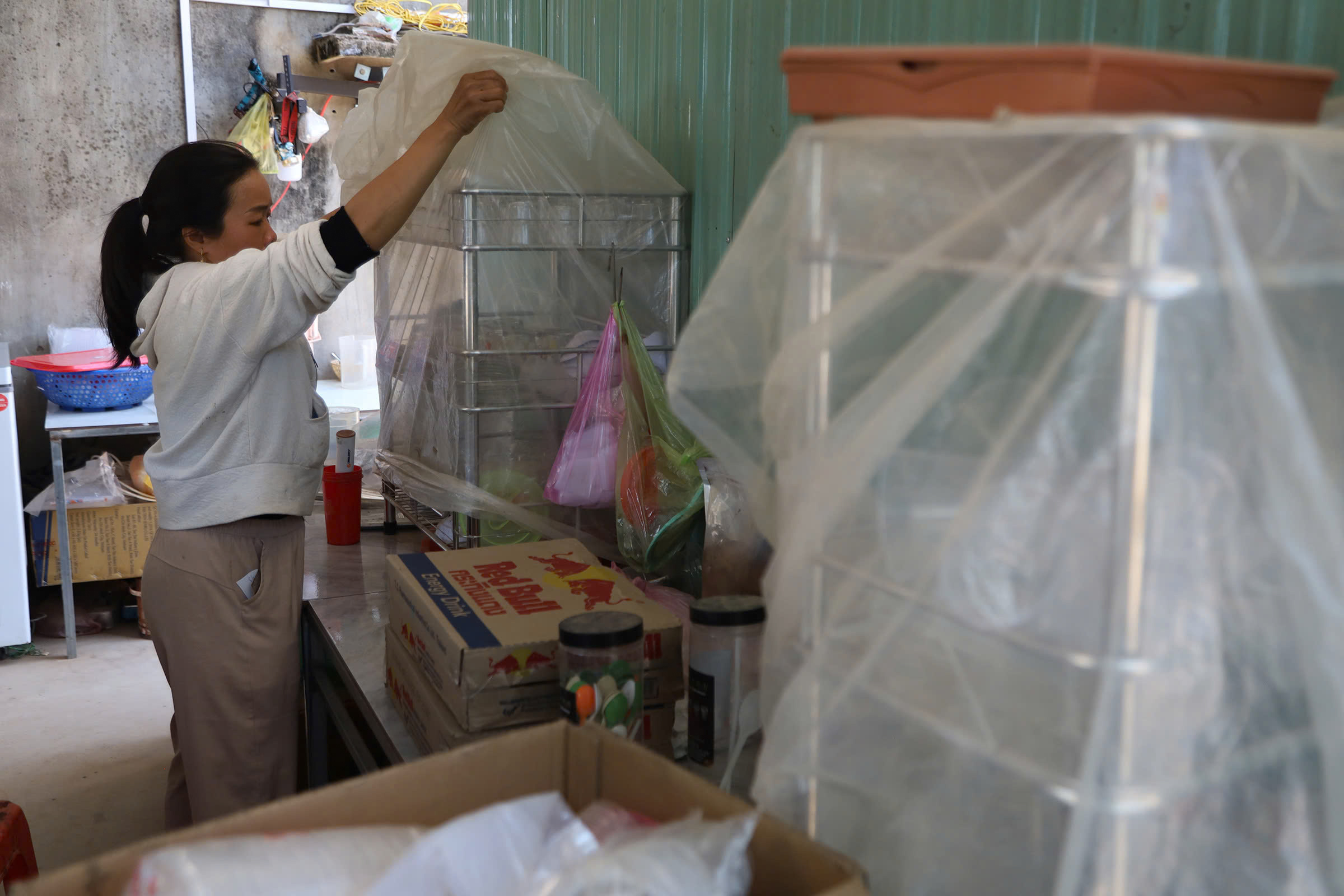 Huong uses nylon to cover her cup and bowl rack to prevent dust. *Tran Hoa*.