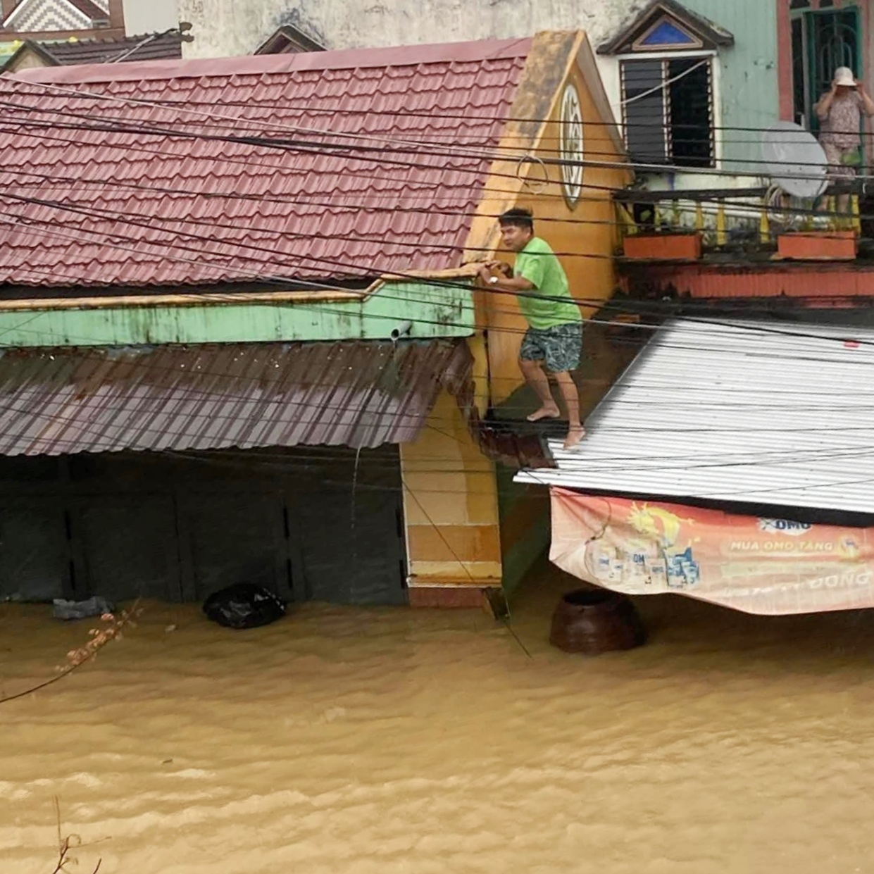 To be seen, some residents stood in the rain on the eaves above their windows. |