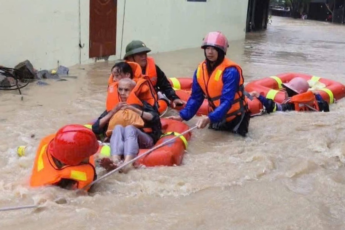 Deeply flooded streets have rendered most road vehicles immobile. Gia Lai Provincial Police are using specialized boats and buoys to transport the elderly and children to safe locations.