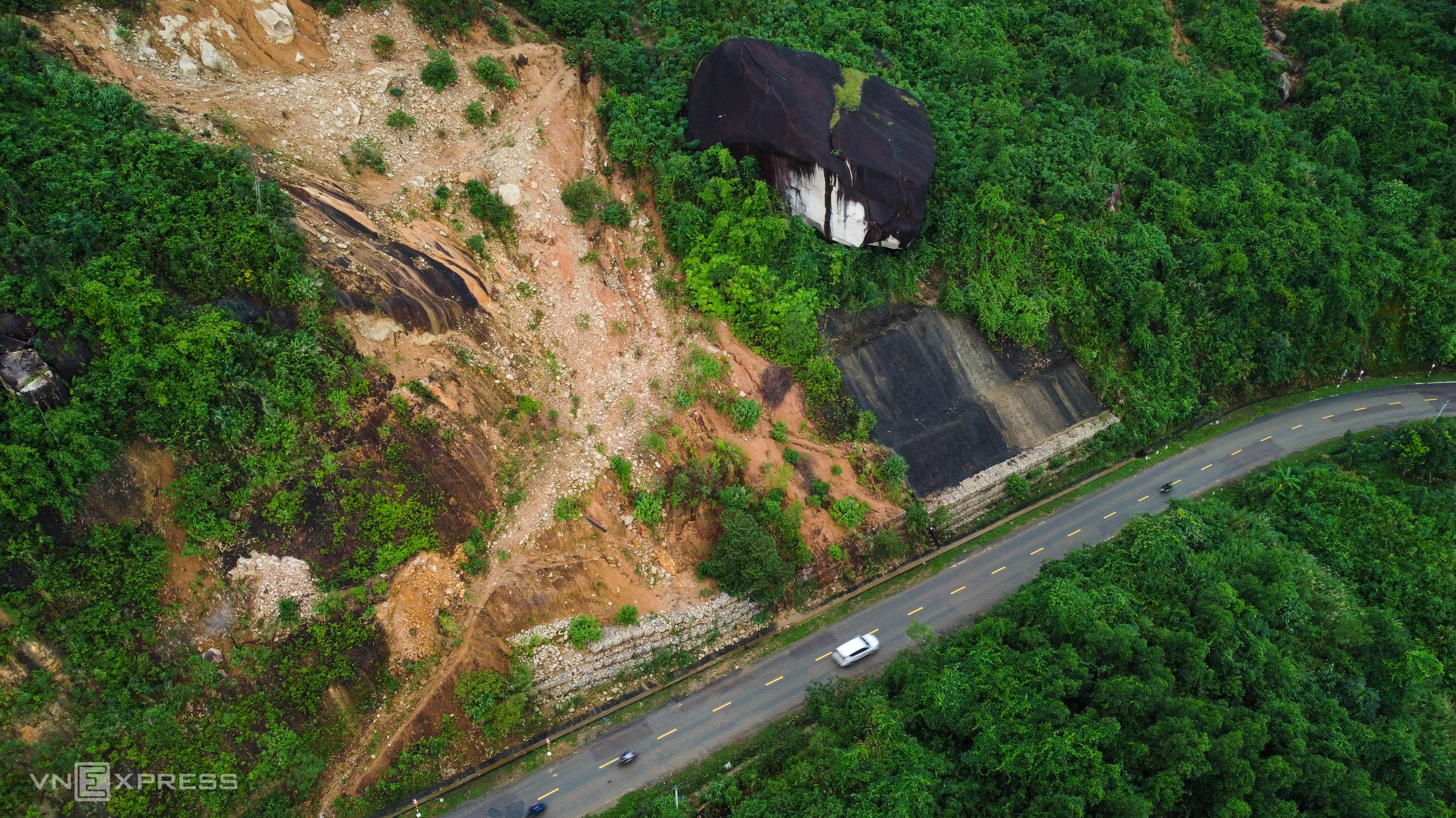 Landslides affected various elevations of the pass. At the foot of Khanh Le Pass in Tay Khanh Vinh commune, a downhill slope landslide encroached upon a section of the road. Authorities have reinforced this area with steel piles to stabilize the geology, awaiting further repair plans. At an elevation of about 200 m, construction crews have cleared a landslide site, though a large rock nearby still poses a risk of collapse. Another hairpin bend at 400 m, known for serious landslides in 2024 and 2025, has been cleared, restoring two-lane traffic.