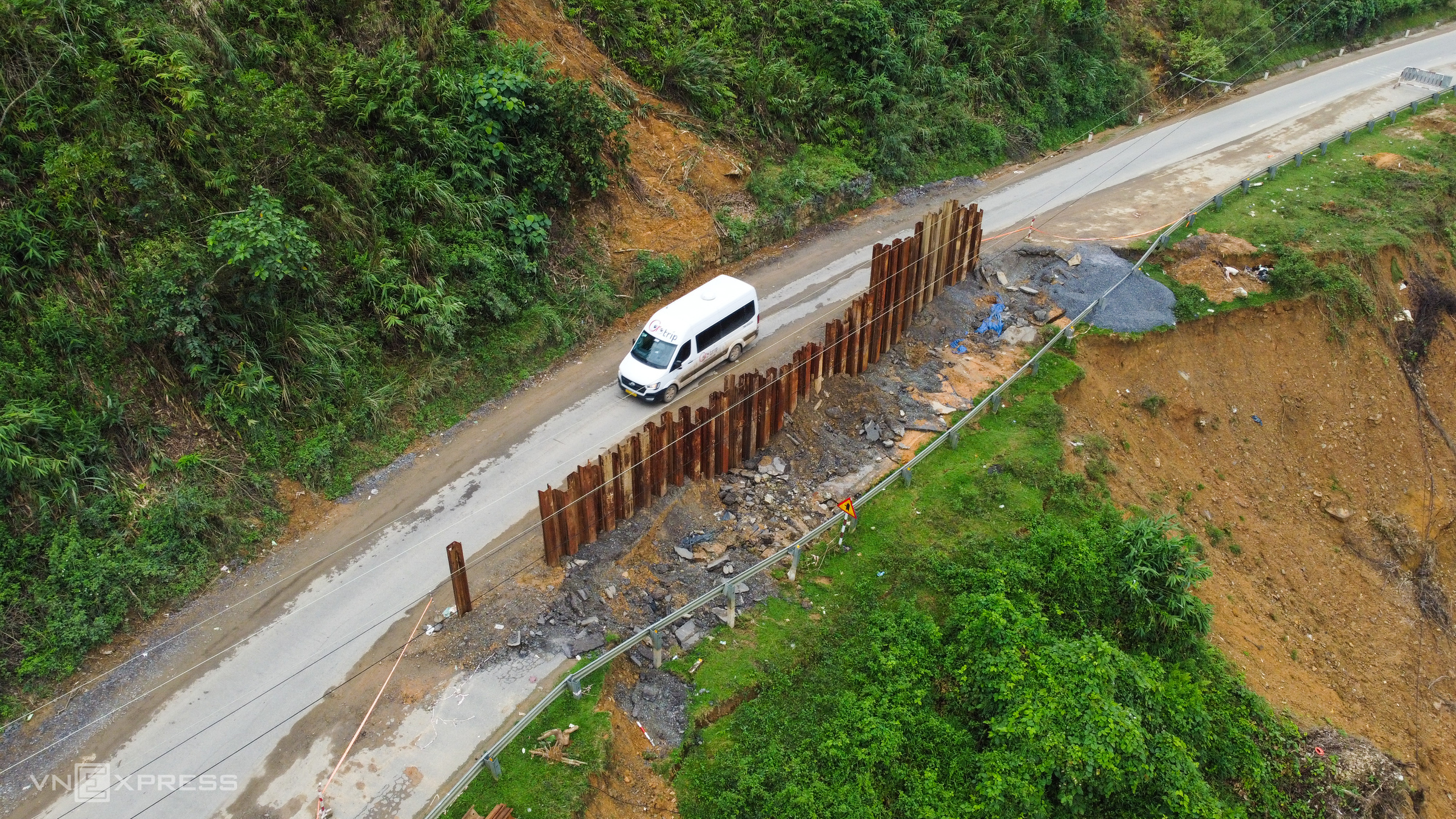 A landslide area on the downhill slope, which took up part of the road at the foot of Khanh Le Pass in Tay Khanh Vinh commune, has been reinforced with steel piles by authorities to stabilize the geology, pending further repair plans.