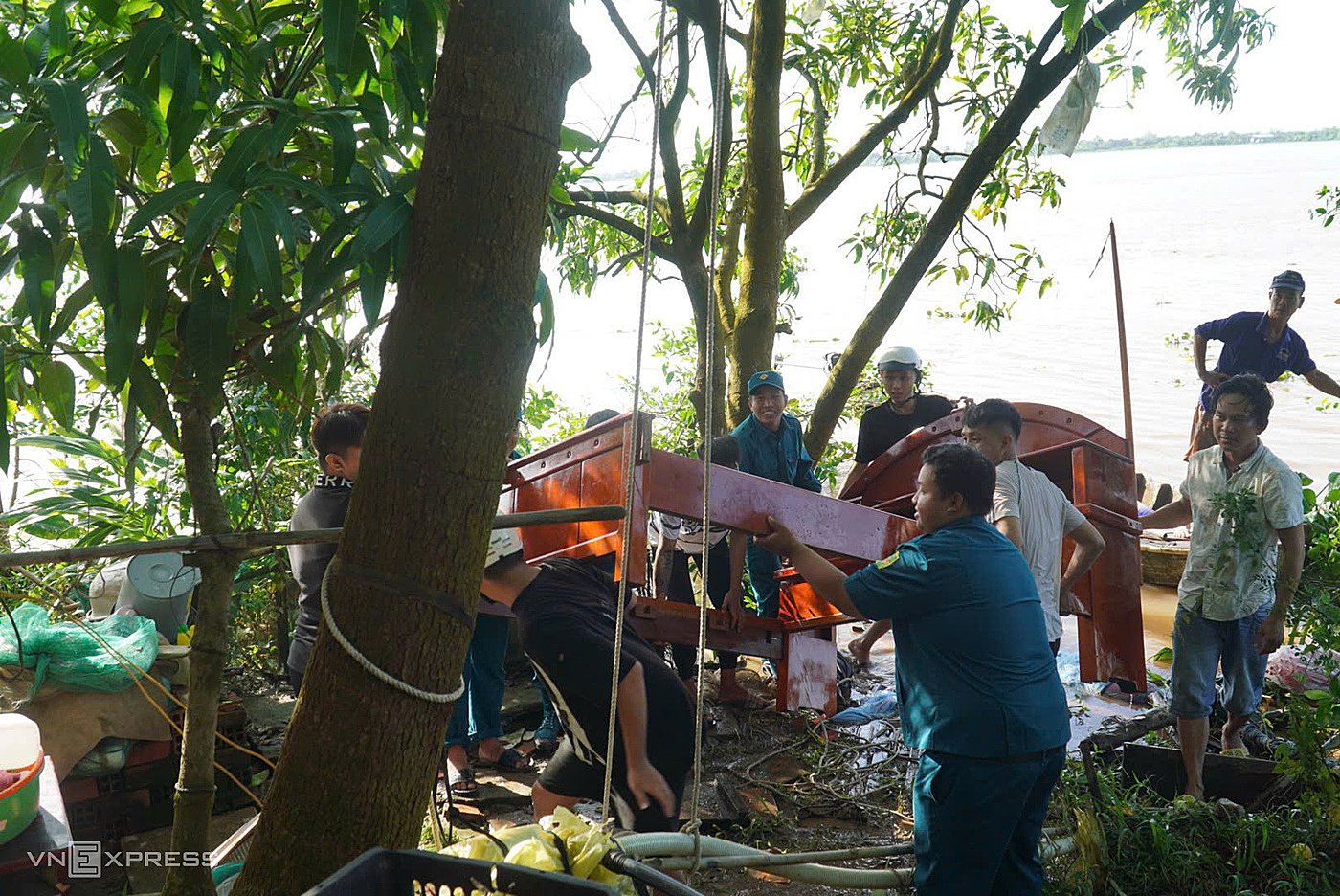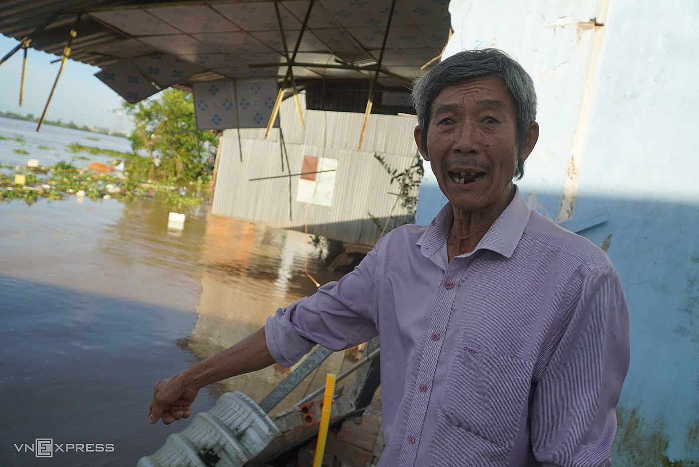 Around 2:30 a.m., a 100-meter section of the riverbank, 20 meters deep, collapsed. 62-year-old Tran Van Nhi was asleep when he heard a loud noise. Before he could react, he and his 20-meter-long house were swept away by the water. He managed to swim to shore with only minor scratches.