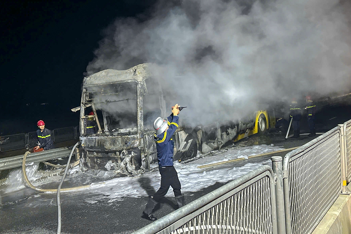 Upon receiving the report, 15 officers from the Ha Tinh Police Department's Fire Prevention and Fighting Police Division, along with two fire trucks, arrived at the scene and sprayed water to douse the flames. After approximately 30 minutes, the fire was brought under control, but the bus was completely destroyed.