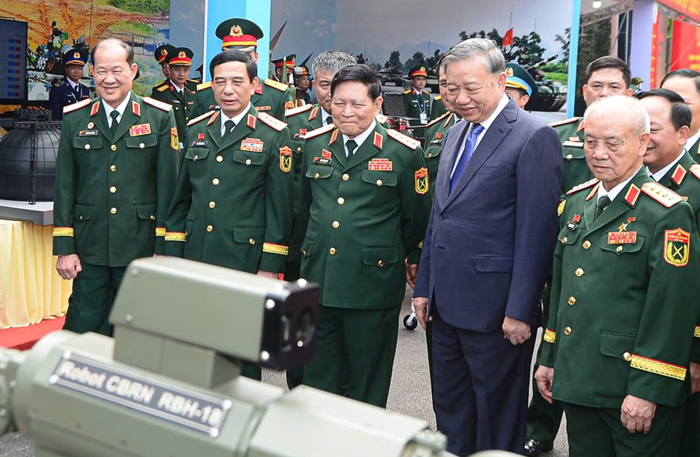 General Secretary To Lam, along with leaders and former leaders of the Ministry of National Defense, viewed the weapons and equipment displayed by the units at the congress. Photo: Hoang Phong