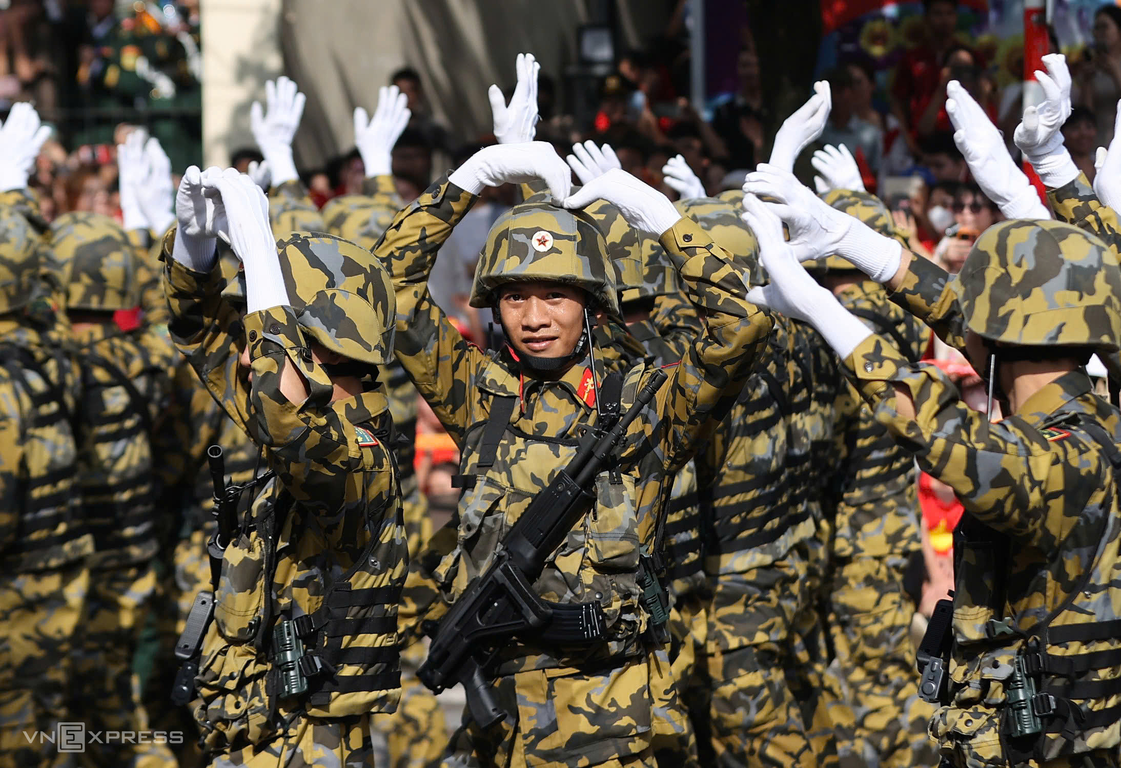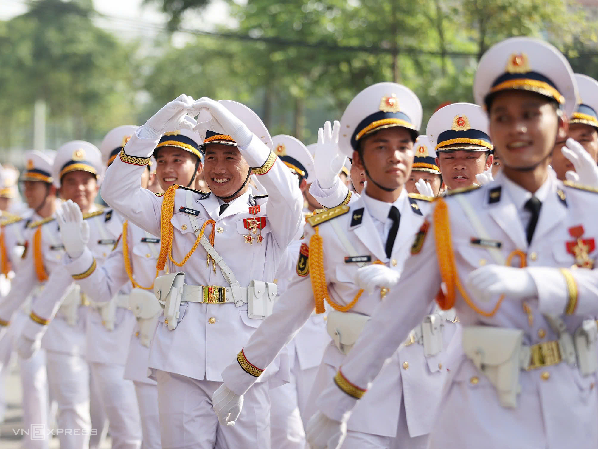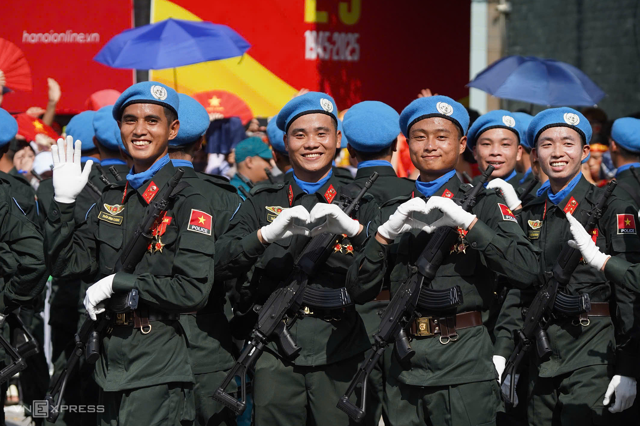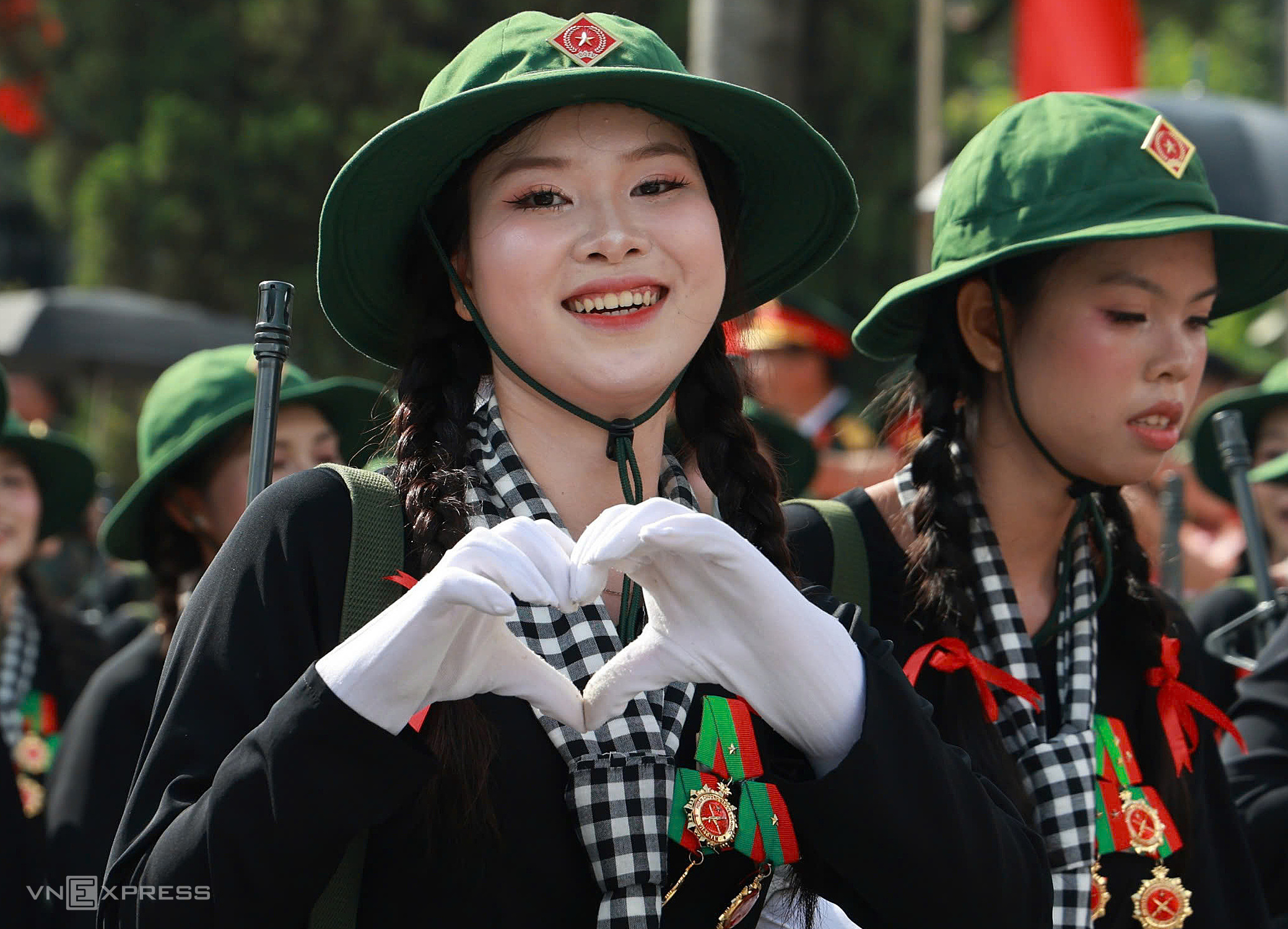 Hanoi this morning was around 28 degrees Celsius. The 2 km march from Ba Dinh square to Quan Ngua sports palace left the female southern guerrillas drenched in sweat, but they still smiled, making heart shapes to show their affection for the cheering crowds. Photo: Duc Dong