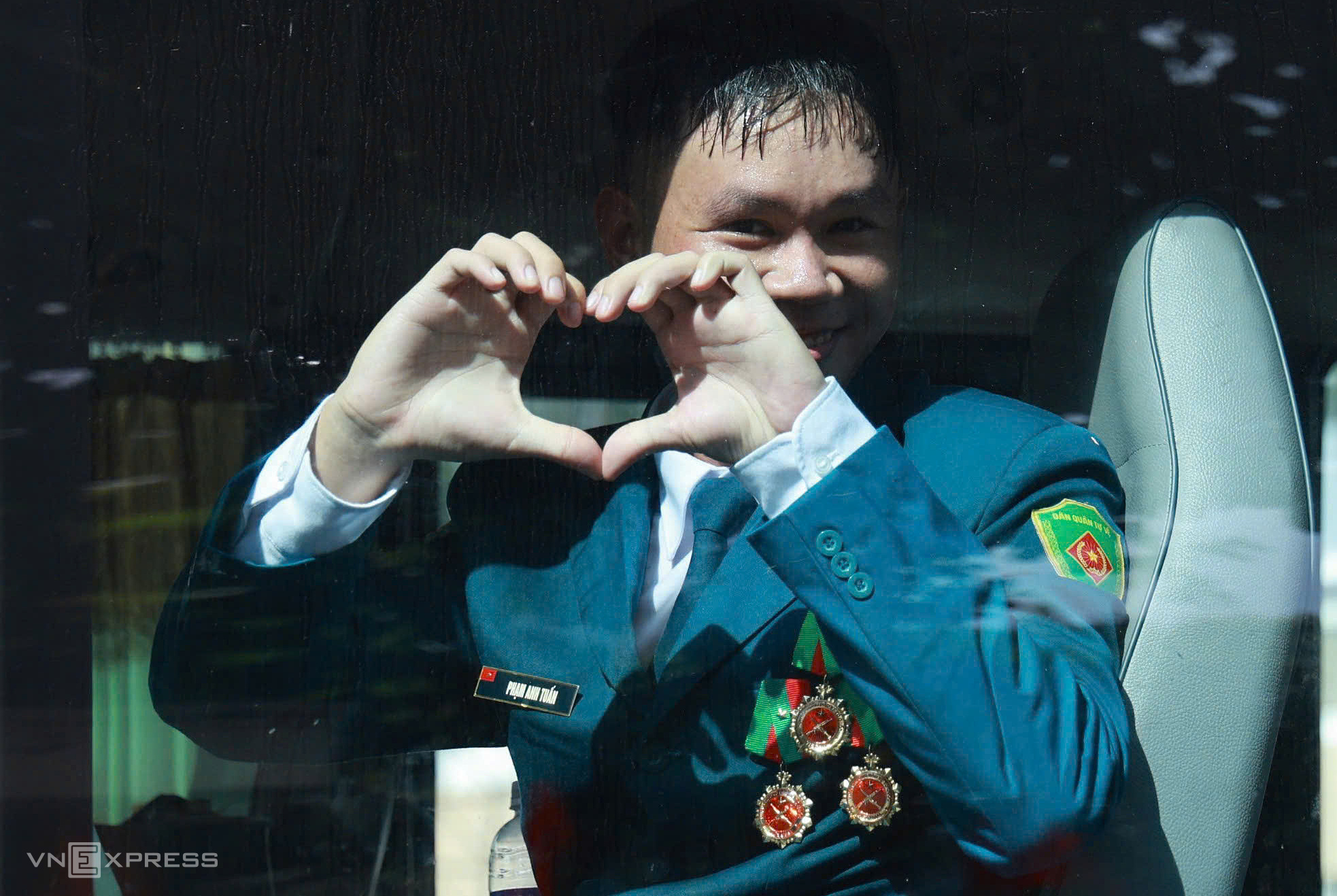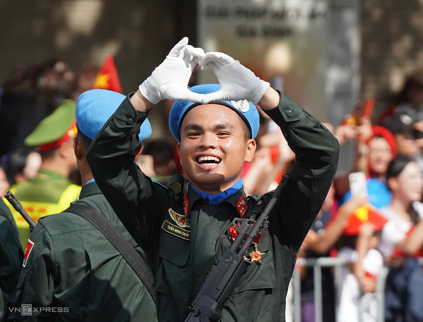 At Quan Ngua stadium, an engineer soldier holds a gun in one hand and makes a heart shape with the other. Photo: Duc Dong