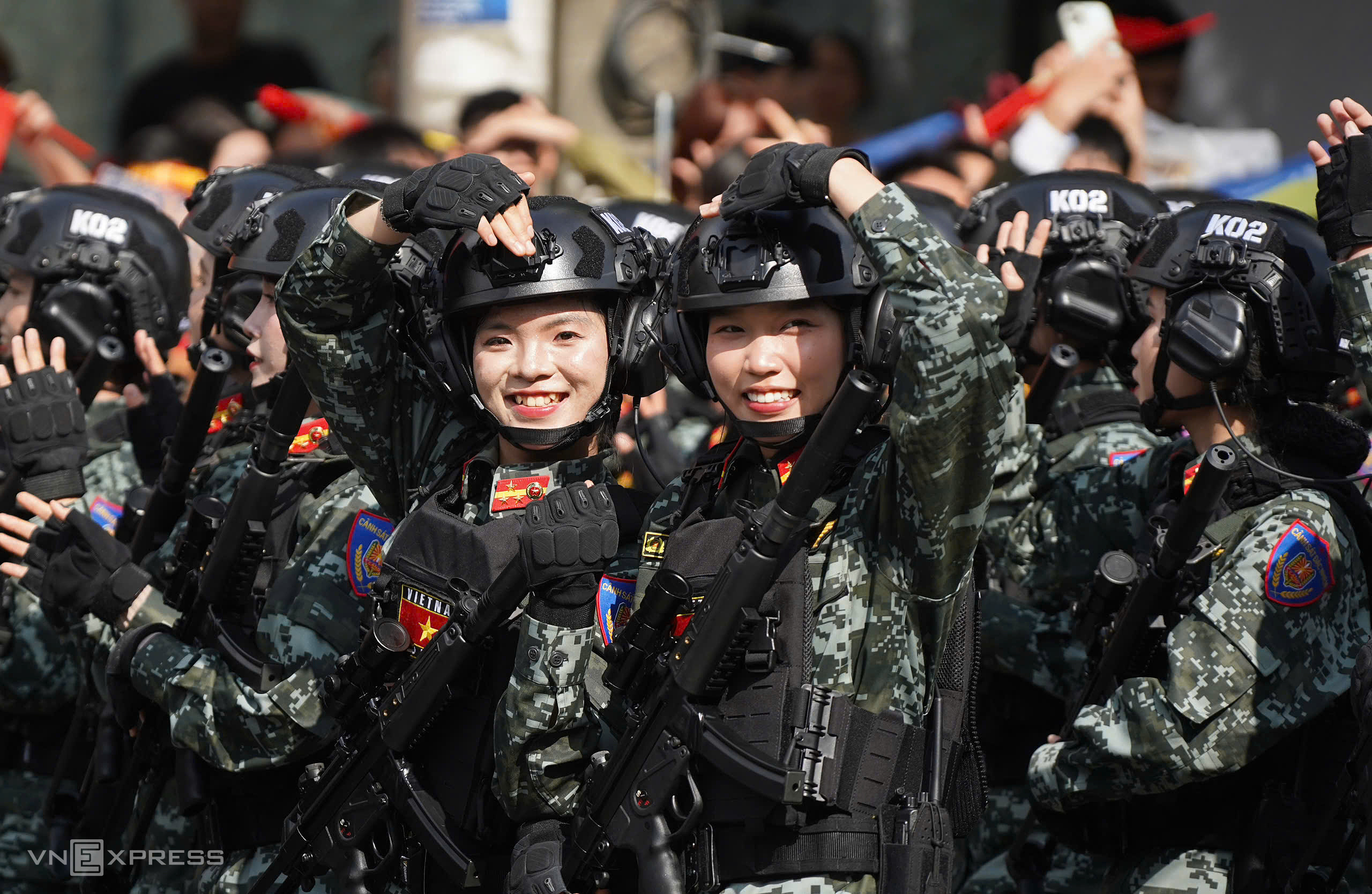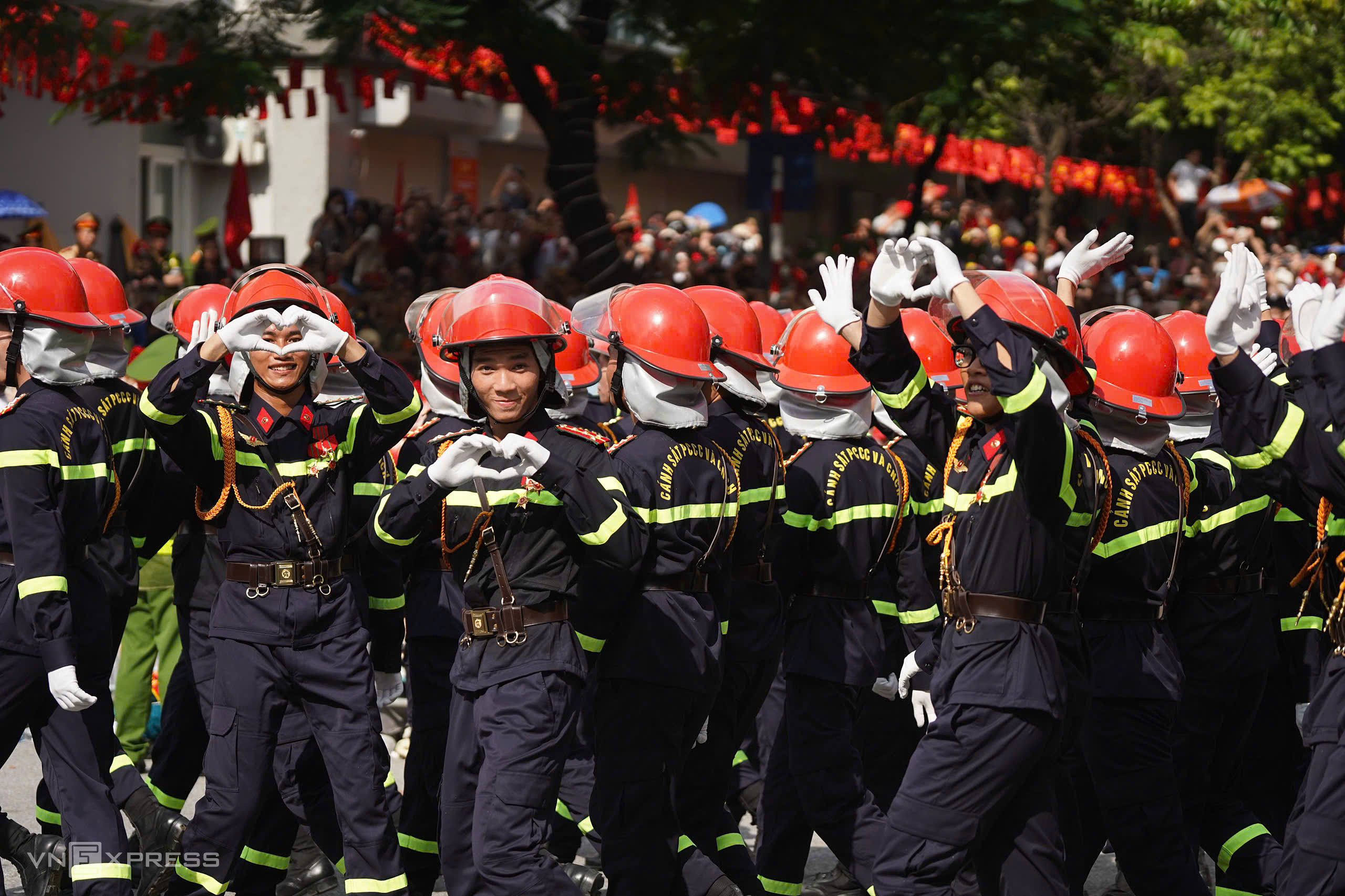 Female special forces police officers from the Ministry of Public Security make heart shapes on Van Cao street. Photo: Luu Quy