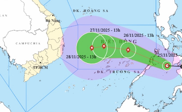 According to the National Center for Hydro-Meteorological Forecasting, on the afternoon of 25/11, the center of the depression was west of central Philippines, causing winds of level 7 and gusts of level 9. The depression is moving west-northwest at 30 km/h. In the next two to three days, the depression is expected to strengthen into a storm, moving slowly westward at 5-10 km/h and potentially strengthening further.