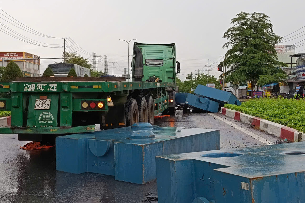 Around 11 am, a container truck carrying four steel blocks, typically used as counterweights for cranes and industrial lifting machinery, was traveling on National Highway 51 from Ba Ria ward towards Tan Phuoc. As it turned into the Cai Mep - Thi Vai port complex, the steel blocks unexpectedly slid off the truck bed and fell onto the road.