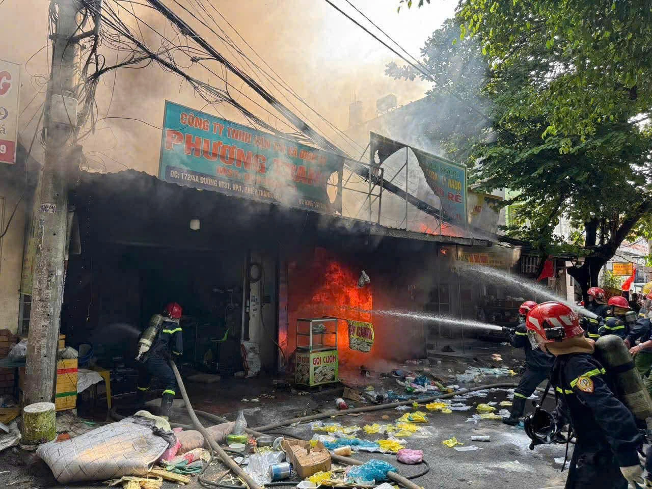 Shortly after 8 AM, a fire broke out at a store selling plastic bowls, plates, and cups, located about one km from the Tan Thoi Hiep overpass. People inside the store fled outside, shouting for neighbors to help use mini fire extinguishers, but their efforts were unsuccessful.