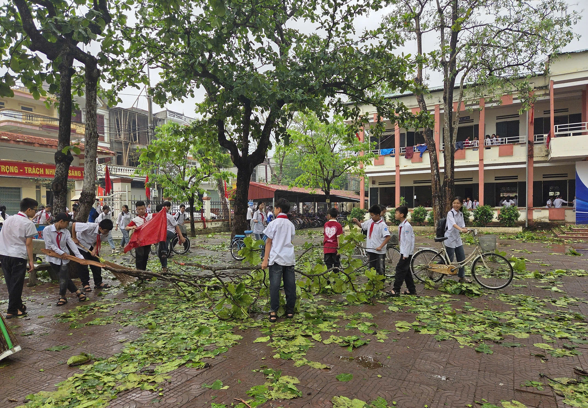 Officials from Thieu Duong secondary school stated that the storm lifted the entire roof section from learning block B, which then landed on the grounds of the adjacent Thieu Duong Kindergarten. Several trees in the secondary schoolyard were broken and felled, with branches and leaves scattered. This morning, teachers and school staff gathered to clean the premises, ensuring safety for students to return to normal classes.