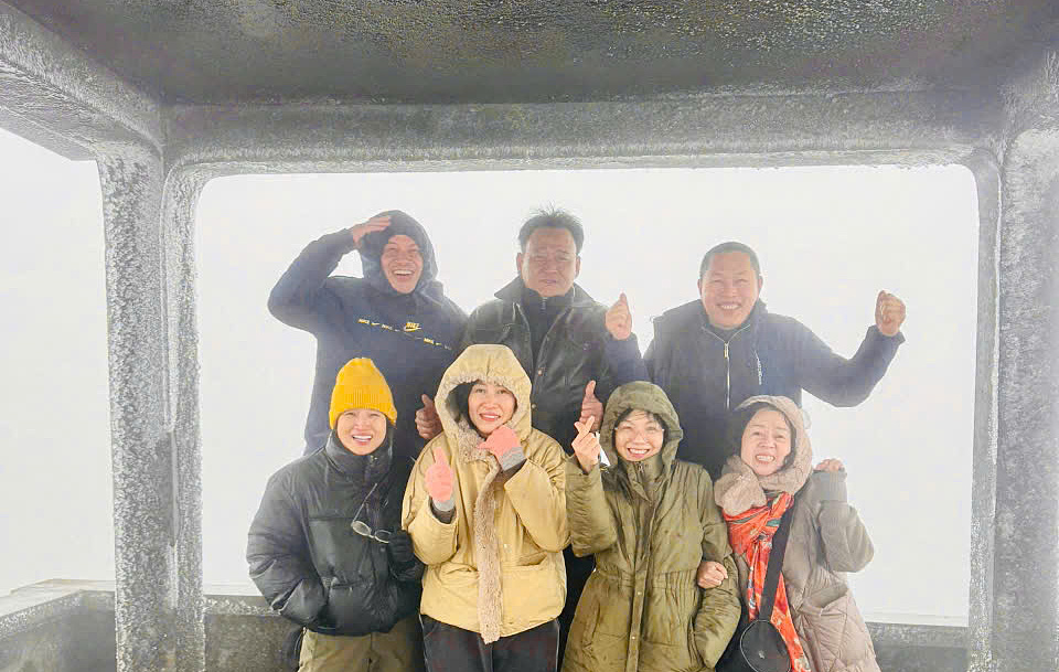 Tourists pose with frost in Mau Son in late 1/2026. *Photo: Trinh Quoc*