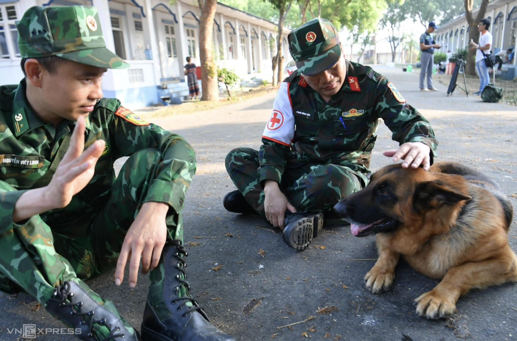Vietnamese soldiers and rescue dogs rest after searching for earthquake victims in Myanmar, 3/2025. Photo: Thanh Dat