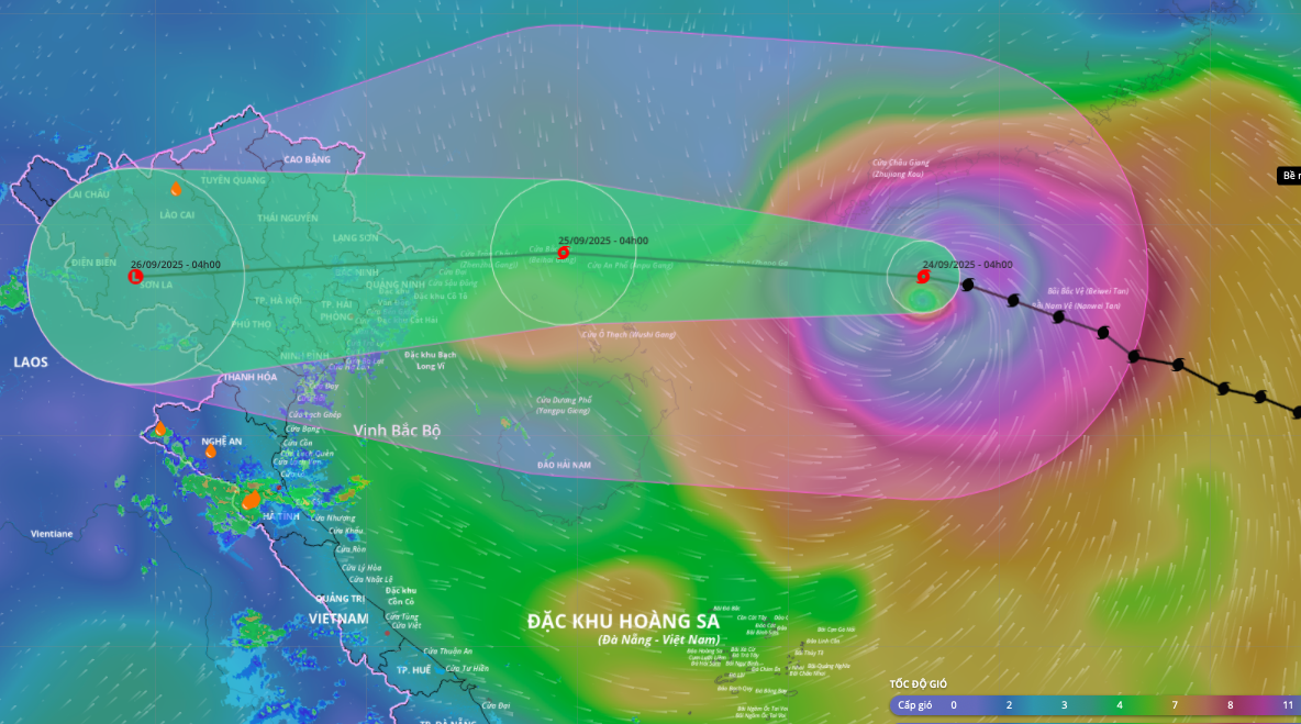 By 4 a.m. on 25/9, the typhoon is expected to be in the coastal waters of Guangxi (China), about 150 km east of Mong Cai, with maximum sustained winds of category 11 and gusts of 13. During the day, the typhoon will enter the Gulf of Tonkin and make landfall in Quang Ninh.