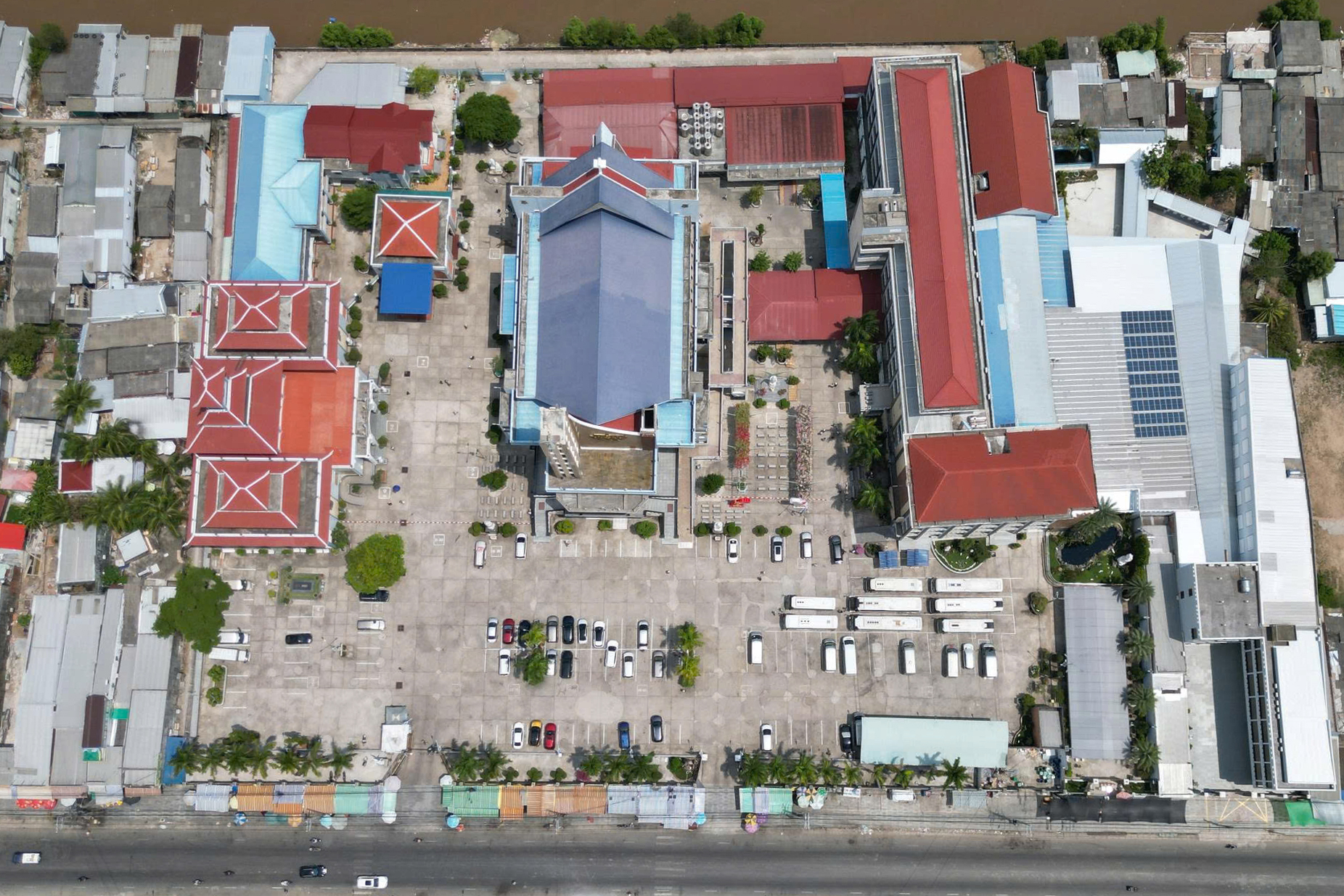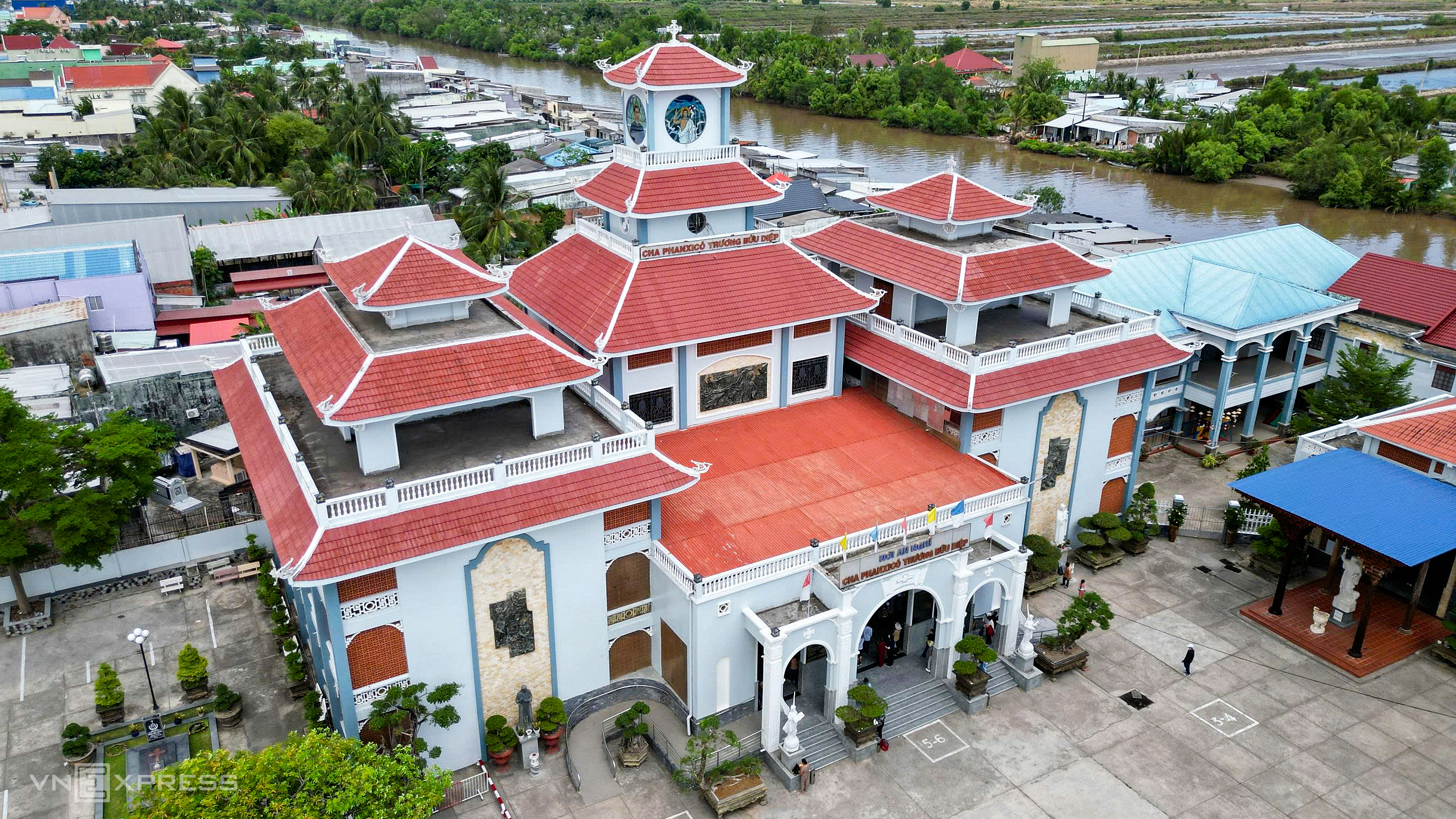 The main church, located at the center of the complex, features a design with ba stories. Its facade is notably clad in brown-yellow stone, with a tall bell tower at the front topped by a white cross and a stylized curved roof. A spacious plaza lies before it, with hai symmetrical staircases leading up to the main floor.